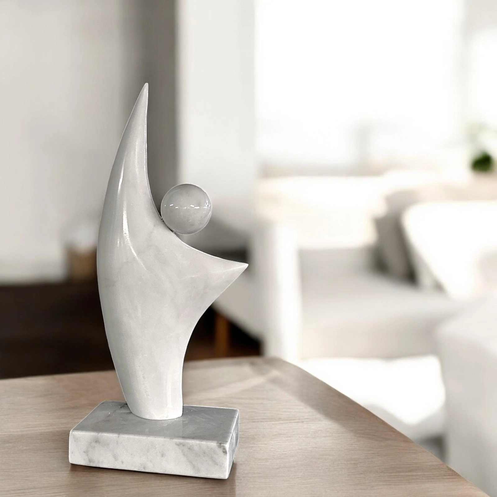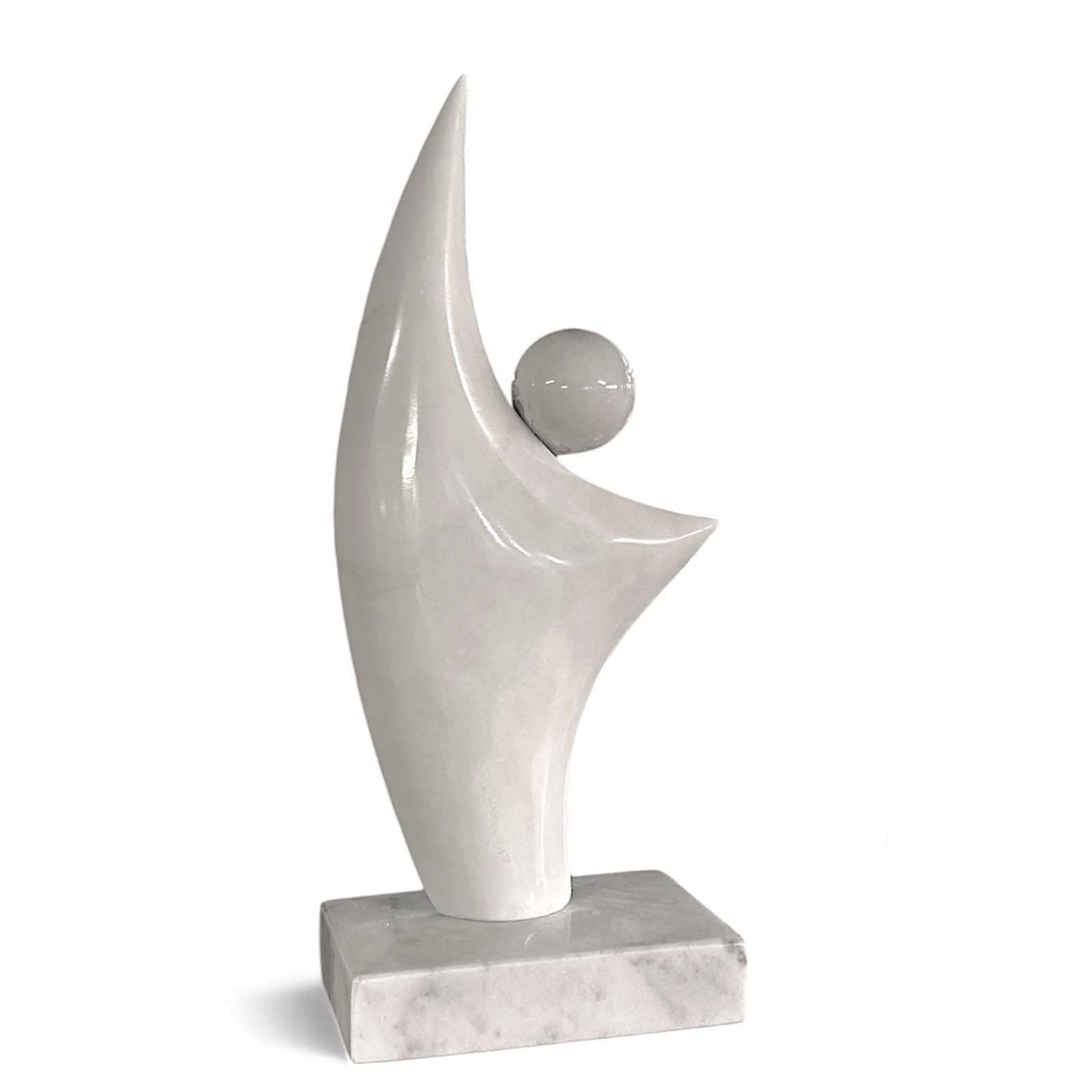 This abstract Carrara marble sculpture is a work of art that captures the essence of lightness and cosmic connection. The sinuous form, rising upward, and the sphere, a symbol of perfection and totality, create a visual dialogue that invites contemplation. Carrara marble, with its purity and luminosity, enhances the form and gives the sculpture an aura of ethereal beauty.