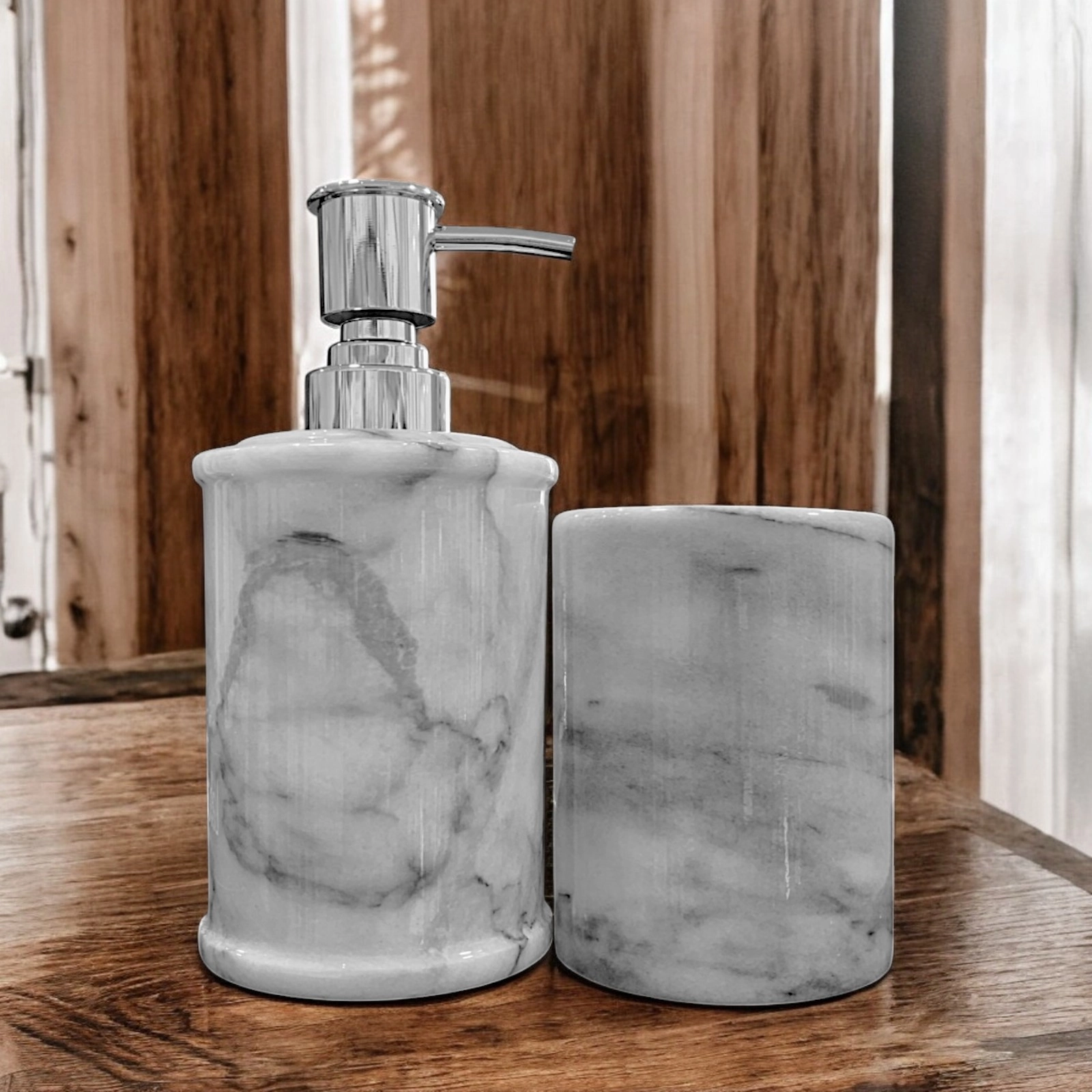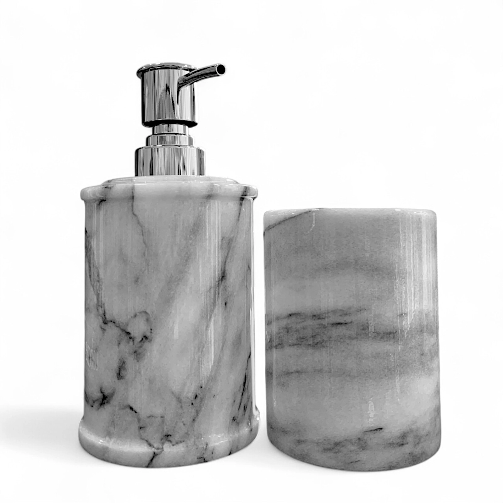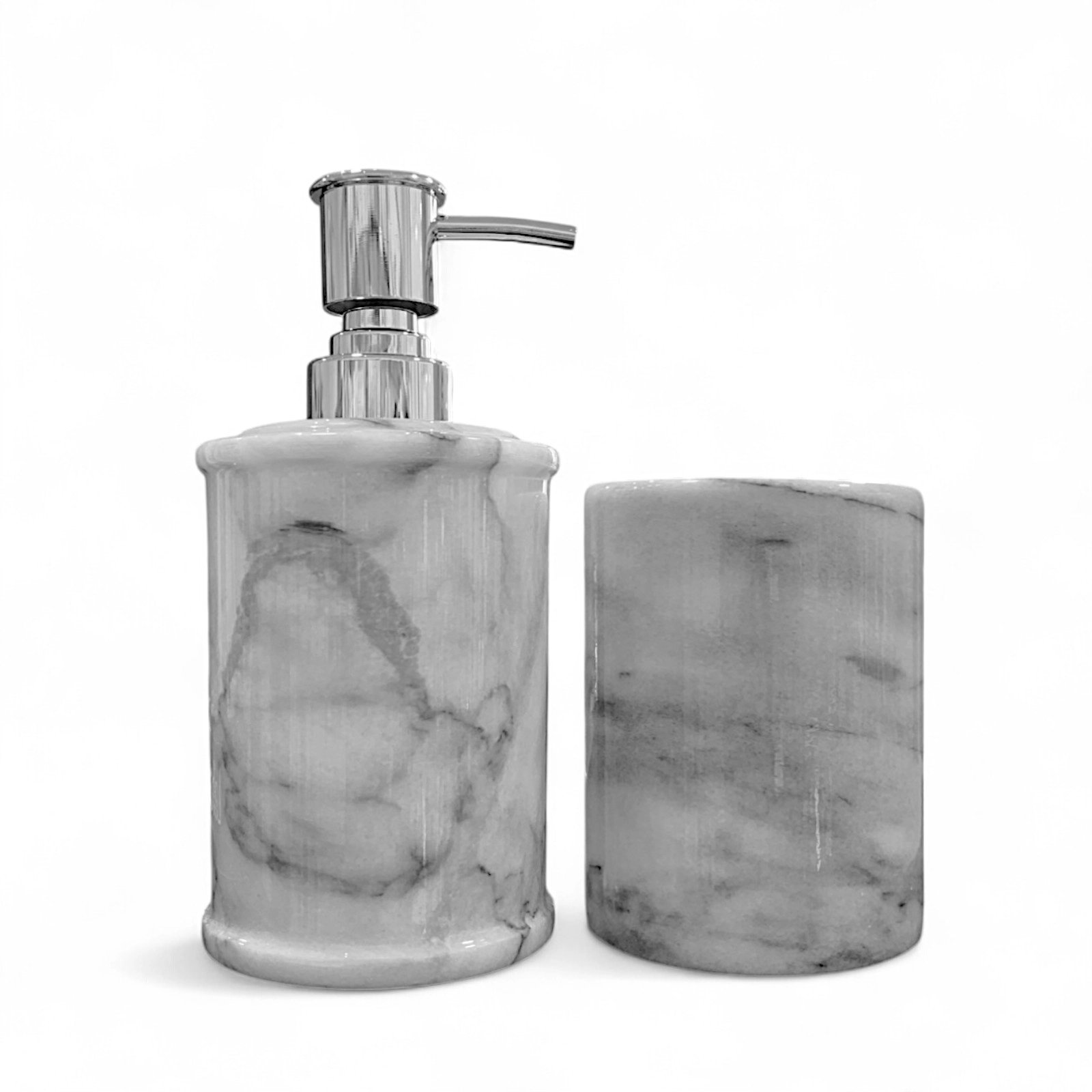 Each item in this set is unique, as the shades and veining of the marble naturally vary from piece to piece, ensuring an exclusive result that cannot be replicated. The clean-lined tumbler and steel-finished dispenser are designed to offer practicality and style in any setting.