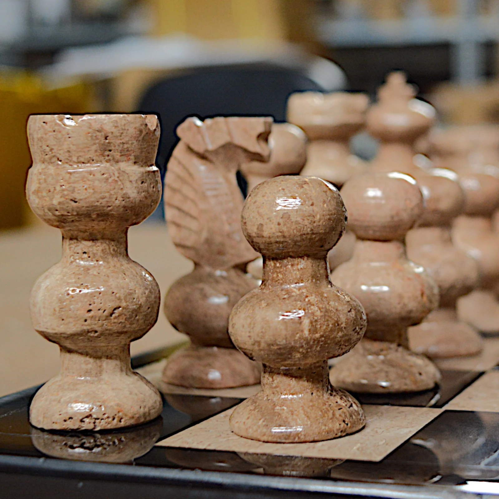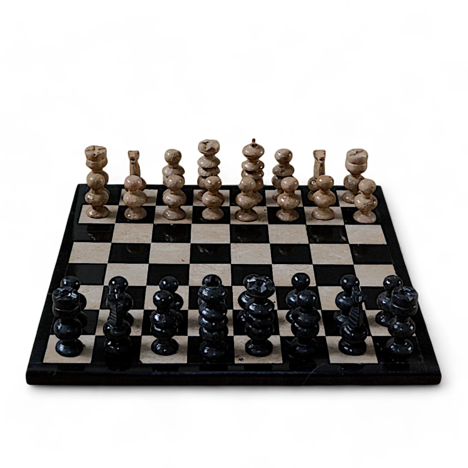 Marble, which has always been synonymous with luxury and durability, is prized for its natural veining, which can come in different shades, making each chessboard a one-of-a-kind piece. The variegated veins create plays of light and shadow that give depth and dynamism to the surface of the chessboard, elevating it to a decorative work of art. Because of these characteristics, marble is widely used in interior design to embellish elegant and sophisticated spaces. Travertine is a natural stone widely used in architecture and design for its beauty and durability. Its natural veining and color variations, ranging from warm shades of beige to light brown, make it an extremely versatile and sought-after material. Travertine is particularly popular for use in upscale interiors, both as a wall covering and for decorative objects. Combined with black marble, it creates a fascinating contrast that elevates the elegance of any room, fitting perfectly with both classic and modern decor styles. This marble and travertine chessboard is designed for true chess and design enthusiasts. Perfect as a display piece or for memorable challenges, it is also a luxurious gift for those who wish to combine a love of the game with a love of elegance. Every detail reflects craftsmanship, making it a symbol of timeless quality and style.