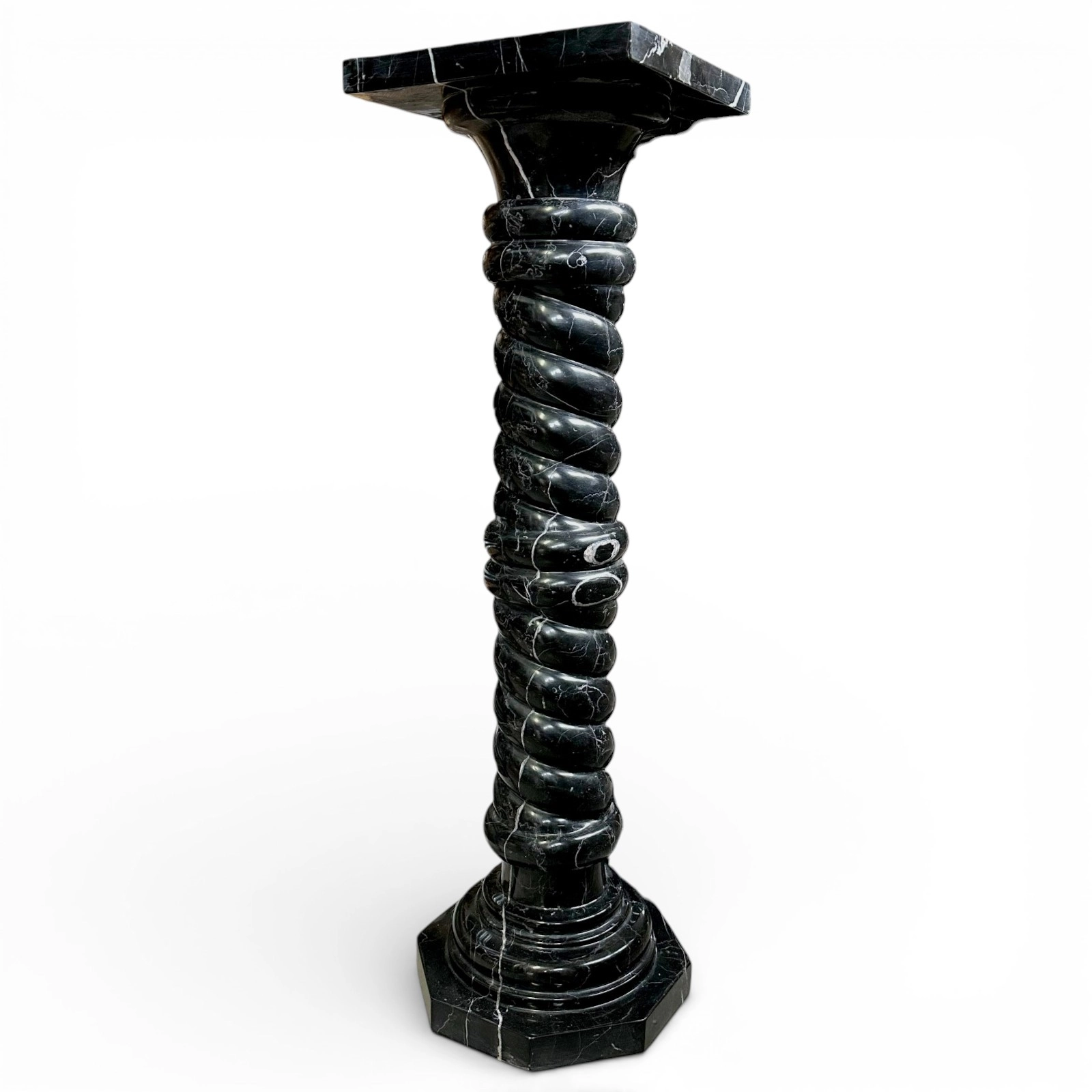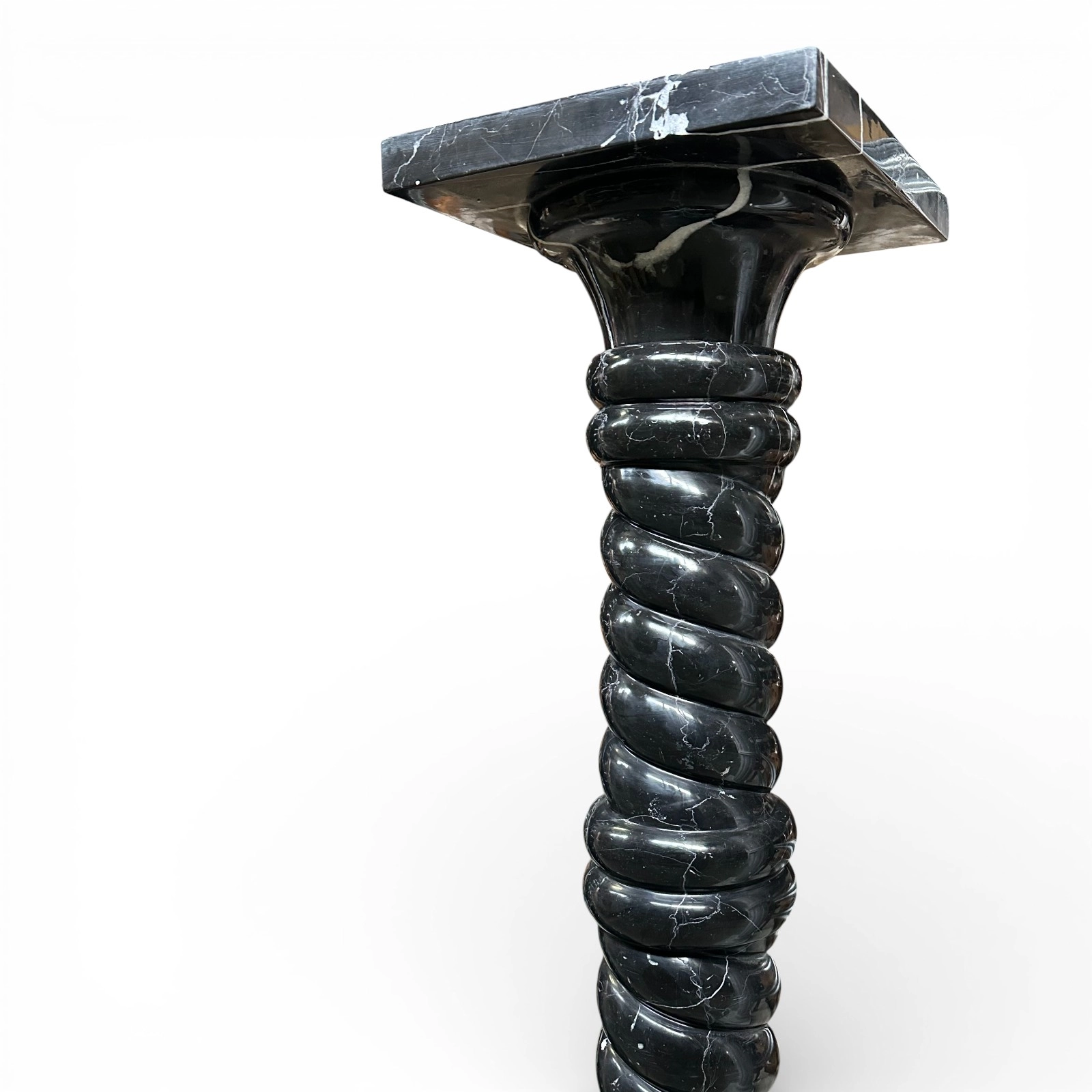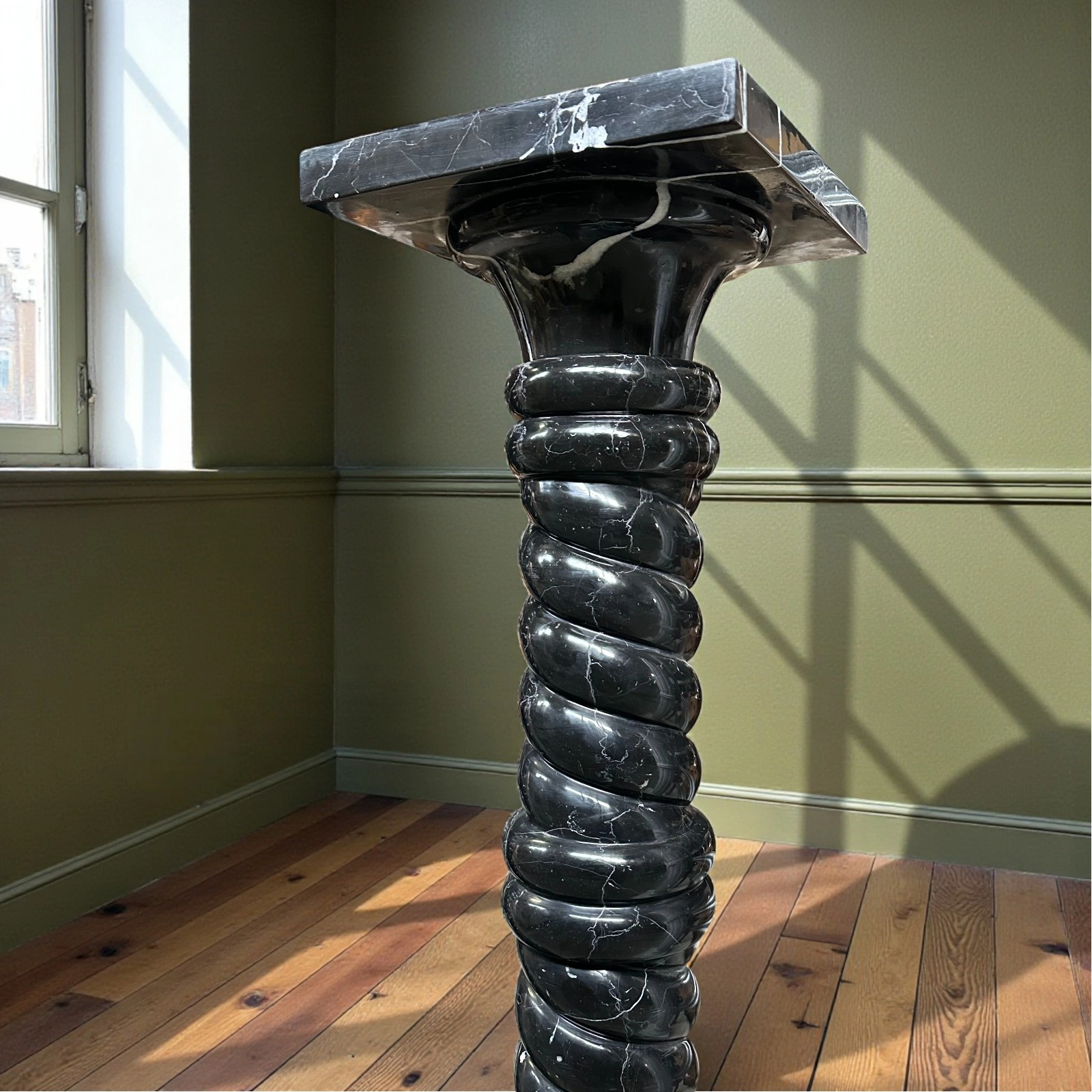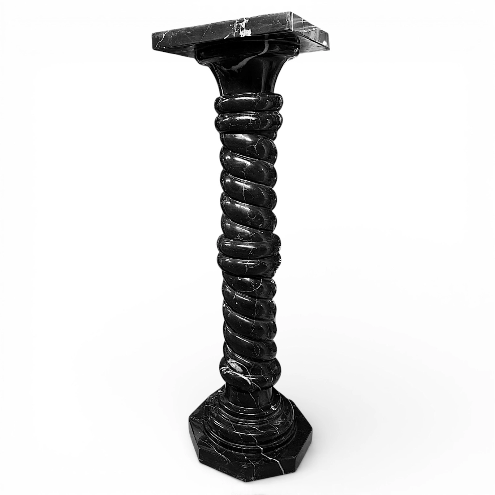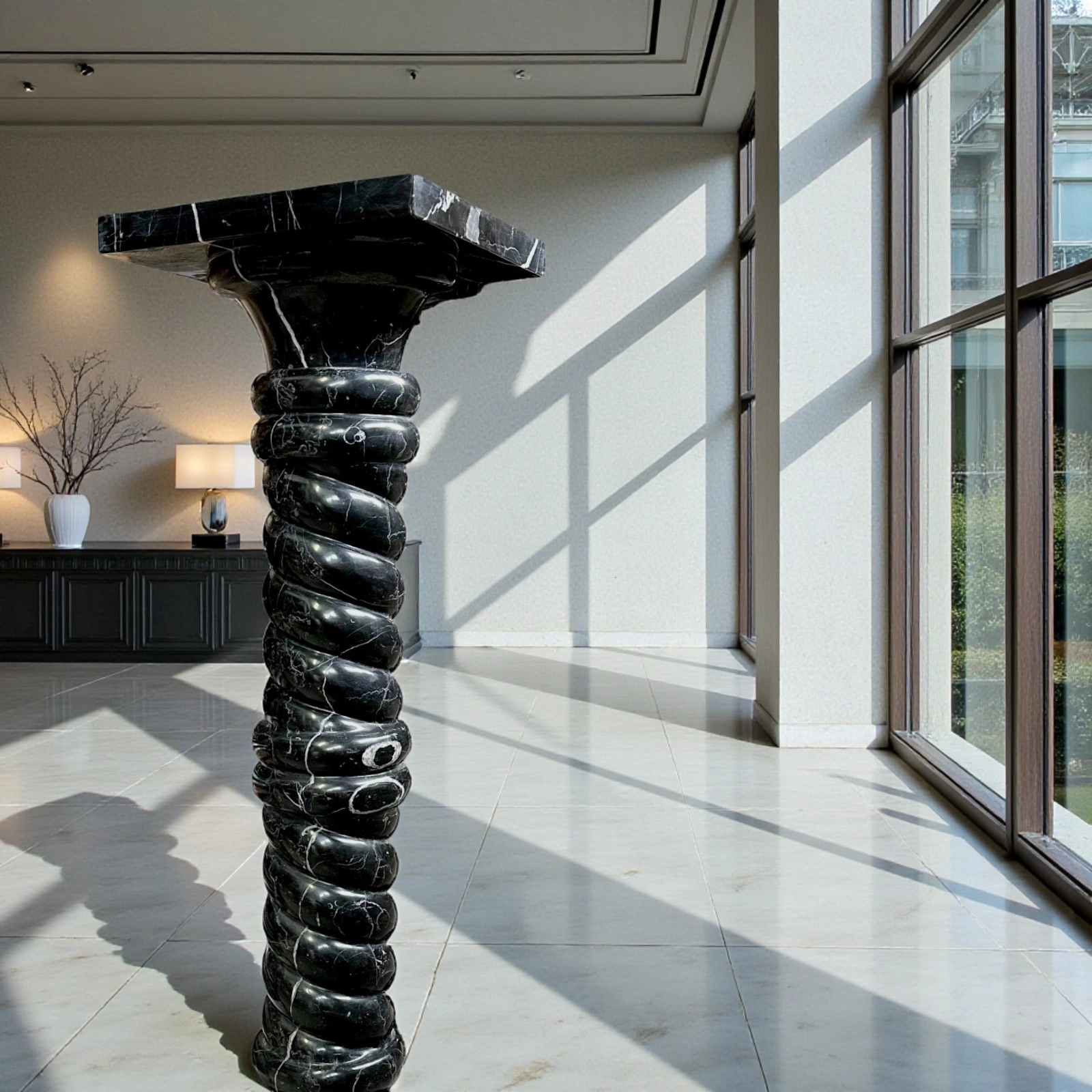 This Black Marquinia marble column is a sculptural piece of great refinement, designed to enhance elegant, high-end residential spaces. Its dimensions feature harmonious proportions and a balanced visual presence. The twisted shaft adds movement and dynamism, making the column a distinctive decorative element that integrates seamlessly into classic, modern, and minimalist interiors.