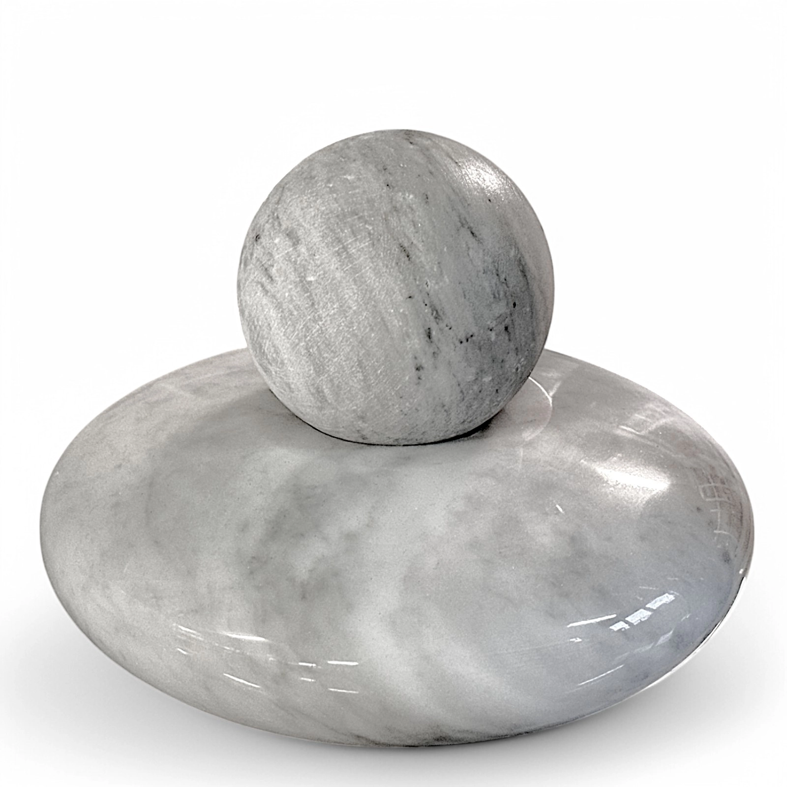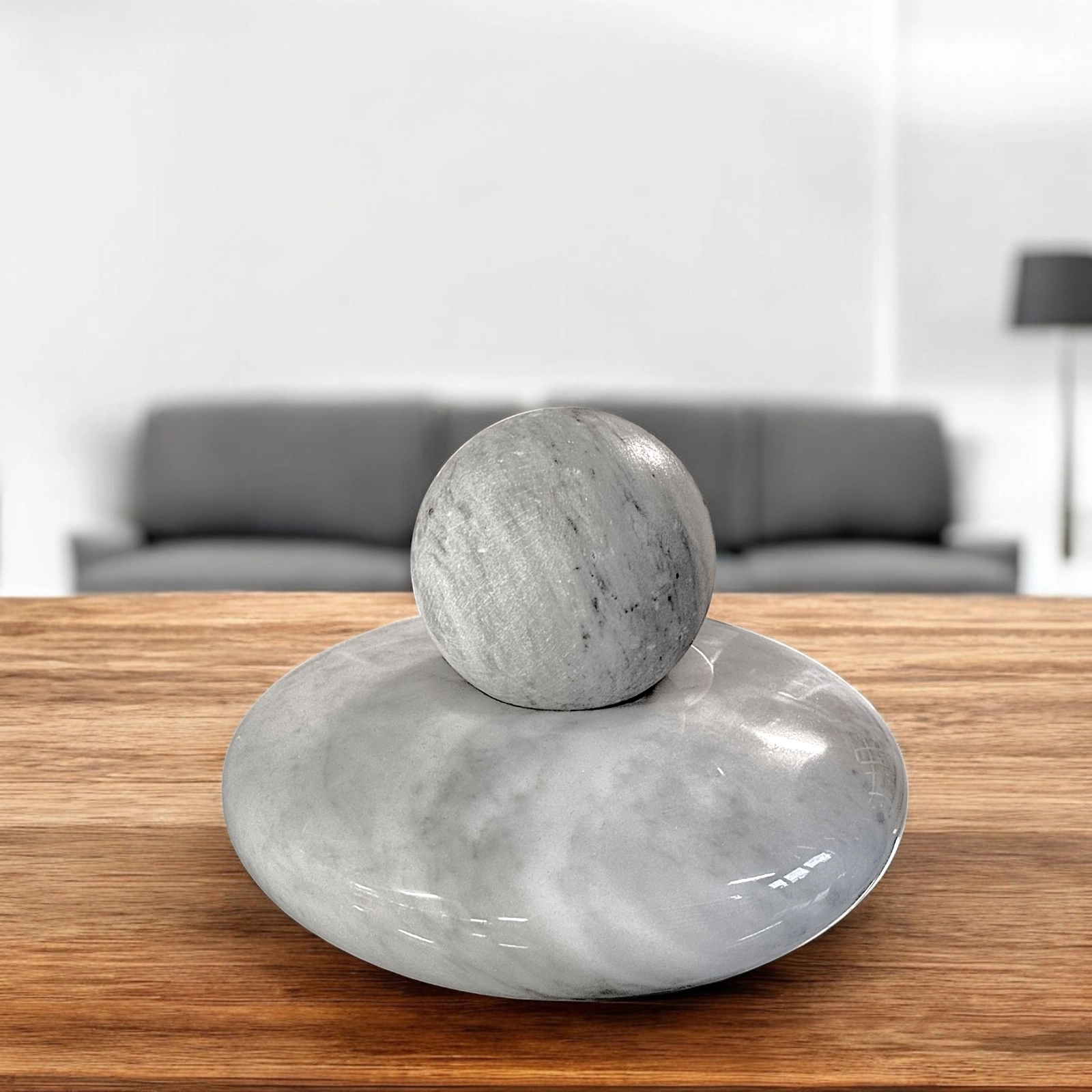 This abstract sphere sculpture is a work of art that celebrates the beauty of form and material. The sphere, a symbol of perfection and harmony, is carved from a natural stone of rare beauty, selected for its unique veining and solidity. The polished texture of the stone enhances the purity of the form and the quality of the material, creating a fascinating contrast between the softness of the surface and the solidity of the stone.