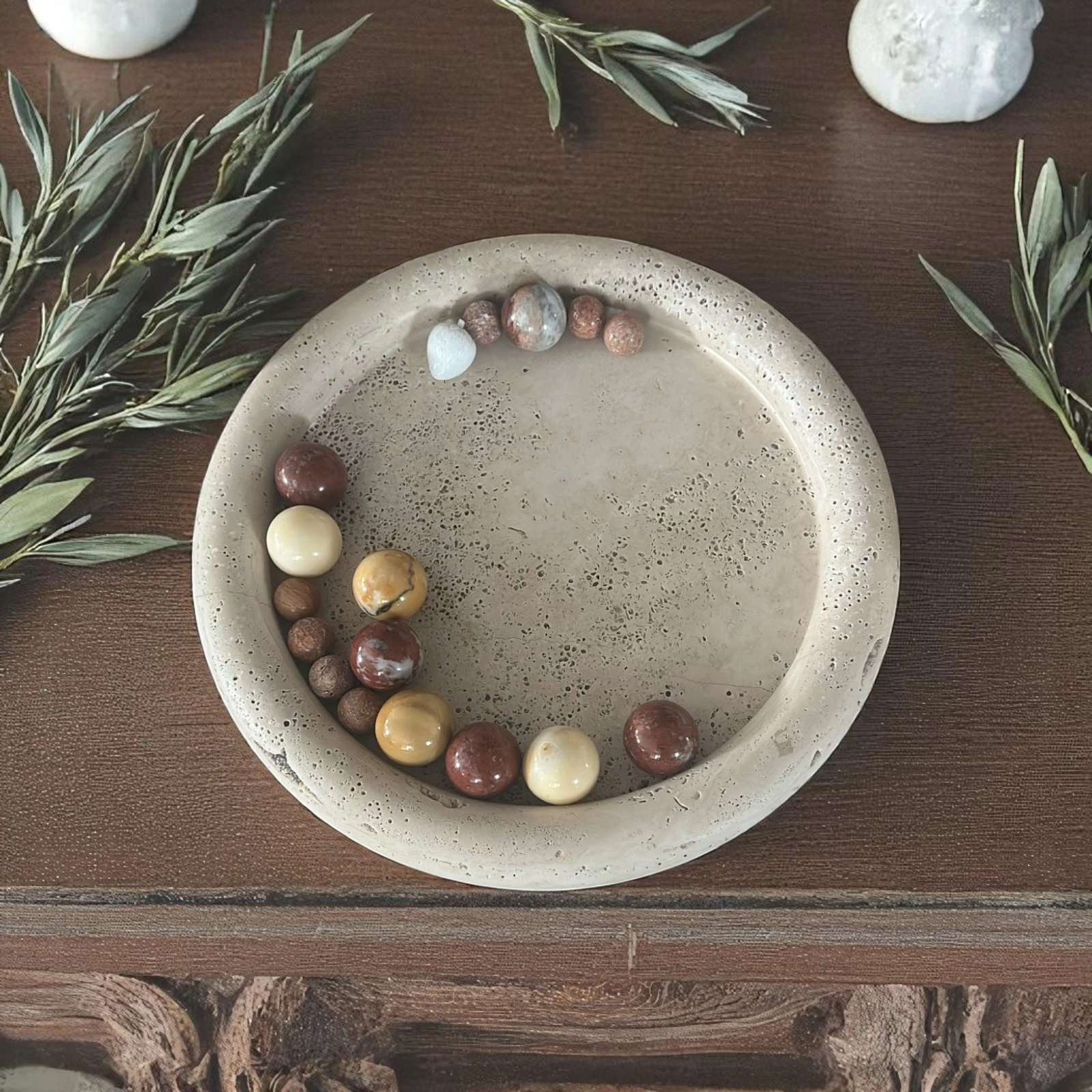 Travertine centerpiece designed to blend harmoniously into any living or professional setting. Furnishes dining tables, entryway consoles, design studios, meeting rooms or sophisticated living rooms with balance. Also perfect for floral arrangements, art objects or thematic displays.