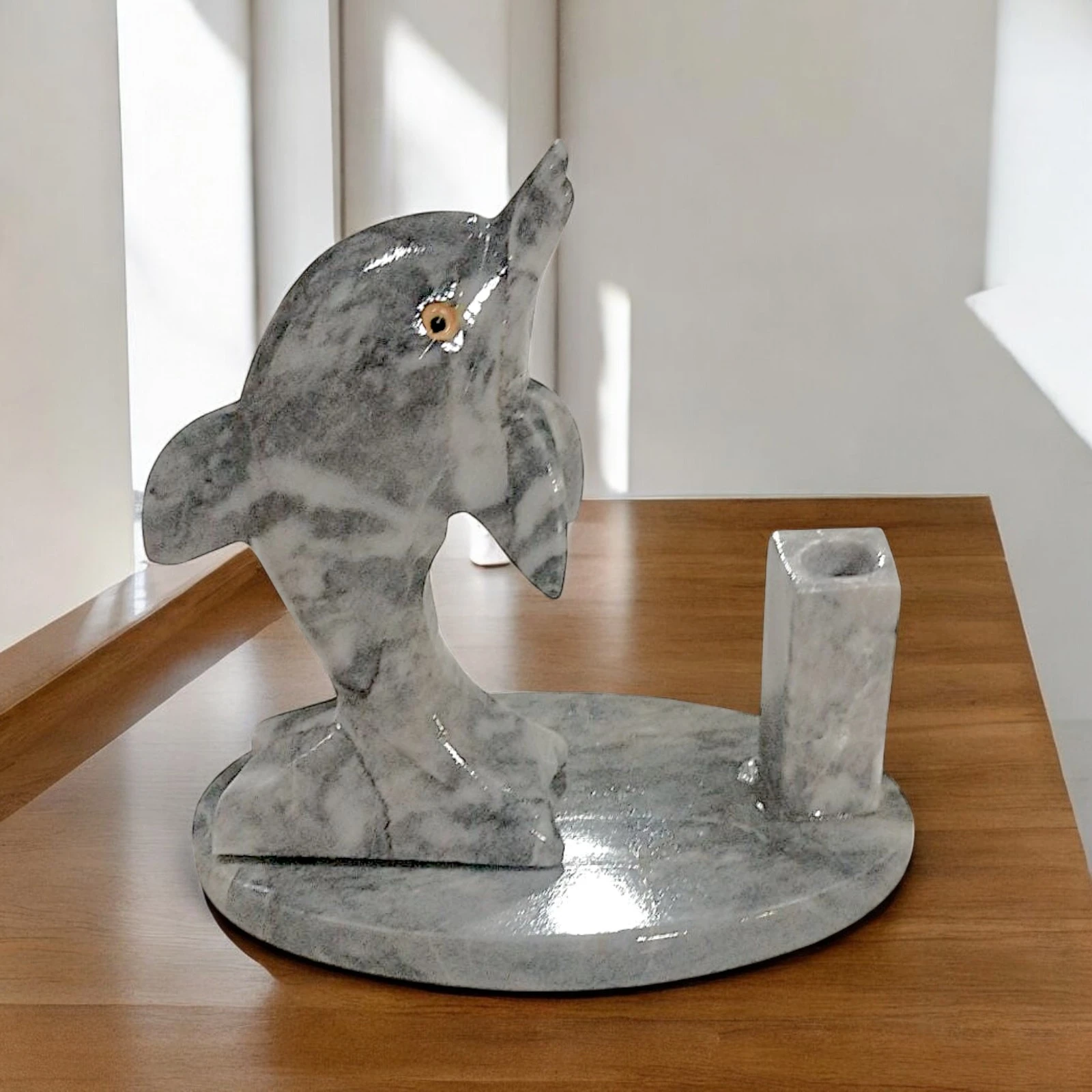 Gray marble dolphin pen holder combines aesthetics and functionality, transforming an everyday object into a design accessory. The sinuous figure of the dolphin, a symbol of harmony and freedom, makes the object perfect for enriching desks, studios and workplaces with a refined touch.