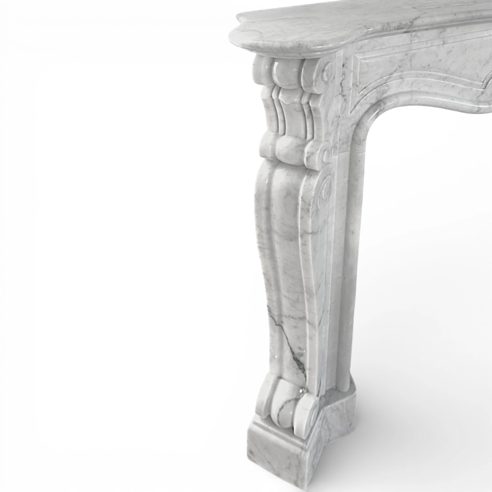 The carved decorations and delicate veins of Carrara white marble provide visual depth and brightness to the structure. The fireplace frame commands attention with an elegant yet balanced presence, enhancing prominent walls and harmoniously integrating into classic, ornate, or contemporary eclectic interior design projects.