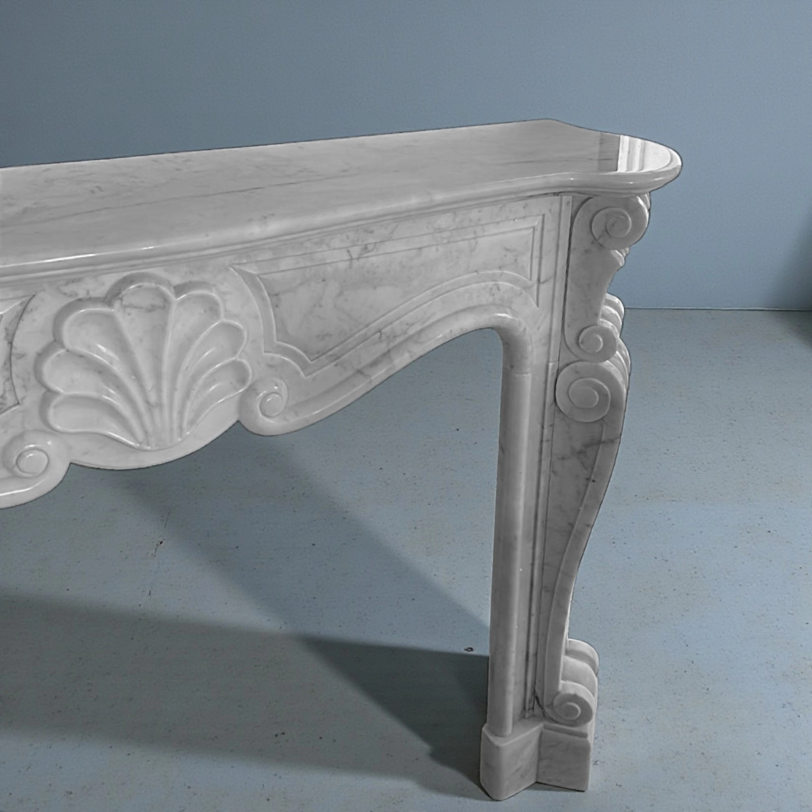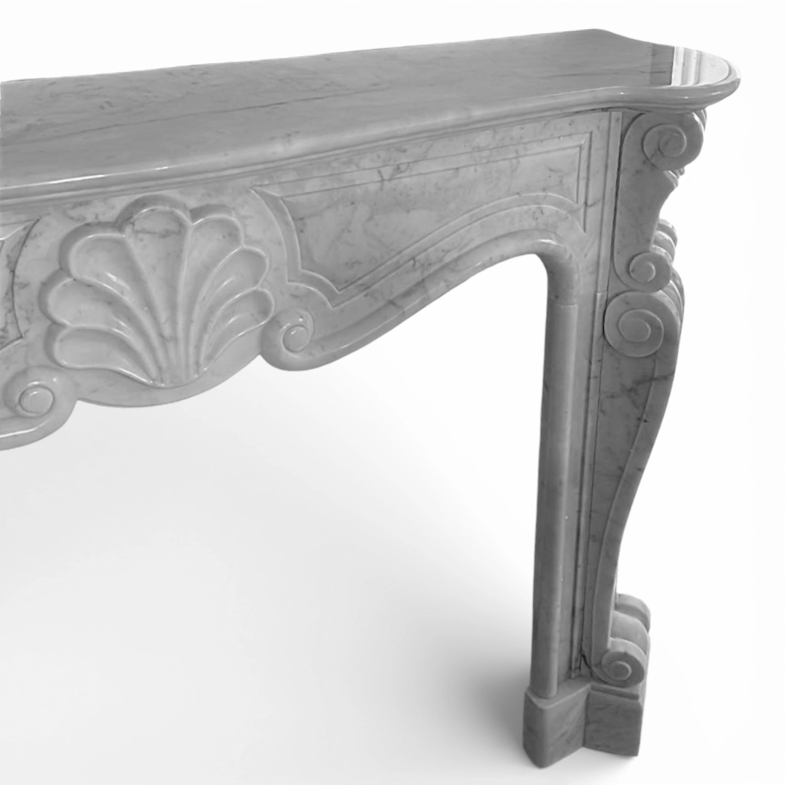 Designed as a central architectural element, this fireplace surround is not just a functional piece but a true focal point of the space. Its decorated lines make it perfectly suited for both historic settings and contemporary environments seeking a material and formal contrast. The quality of Carrara marble and the artisanal craftsmanship make each piece unique and one of a kind.