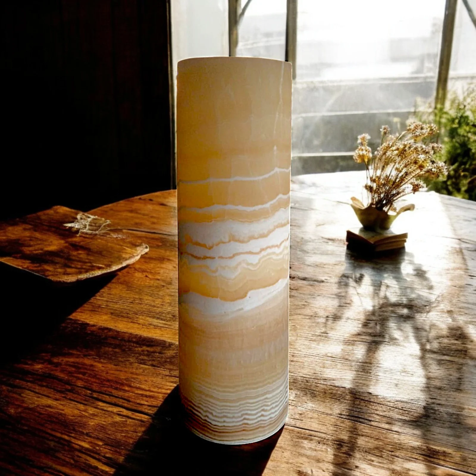 Natural onyx is valued for its translucence, capable of diffusing light evenly and suggestively. The lamp thus becomes not only a decorative object, but also a light source capable of creating an intimate and welcoming atmosphere. Perfect as a point of light on a desk, bedside table or console, it adds an exclusive touch to the most sought-after spaces.