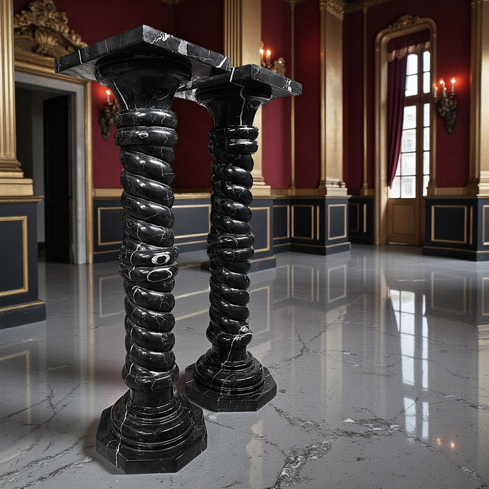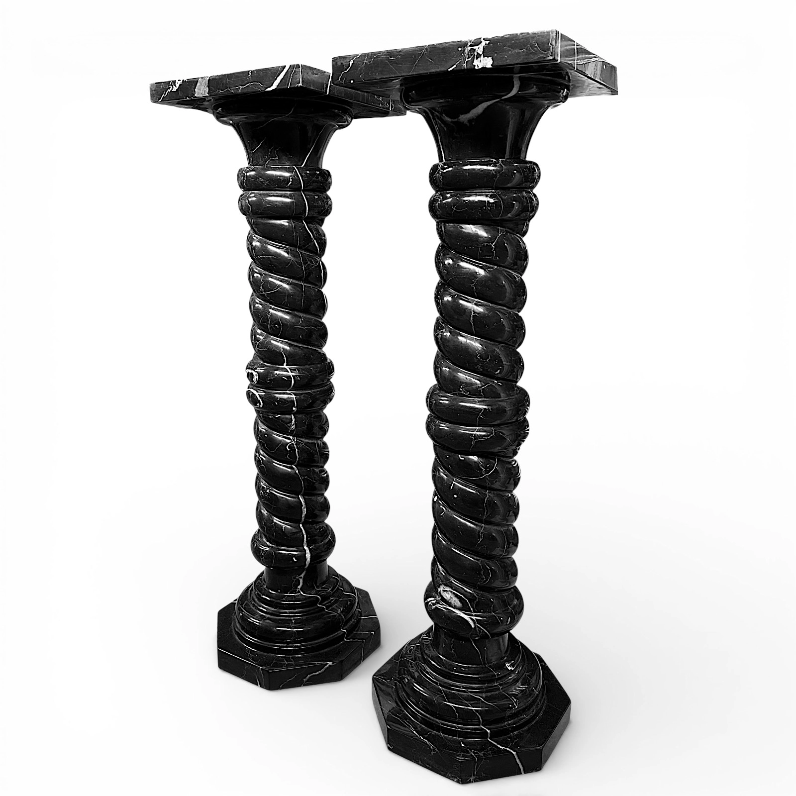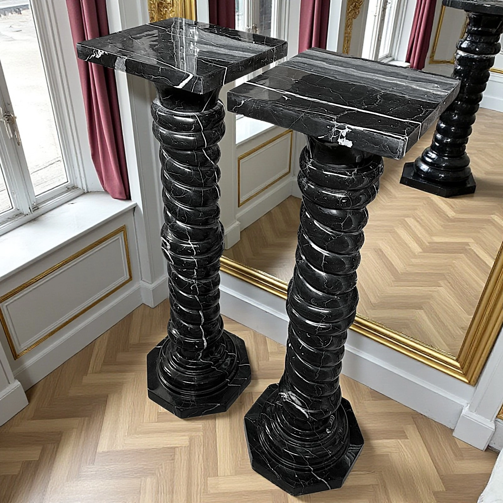 These two Black Marquinia marble columns are sculptural pieces of great refinement, designed to enhance elegant, high-end residential spaces. Their dimensions ensure harmonious proportions and a balanced visual presence. The twisted shafts add movement and dynamism, making the columns distinctive decorative elements that integrate naturally into classic, modern, and minimalist interiors.
