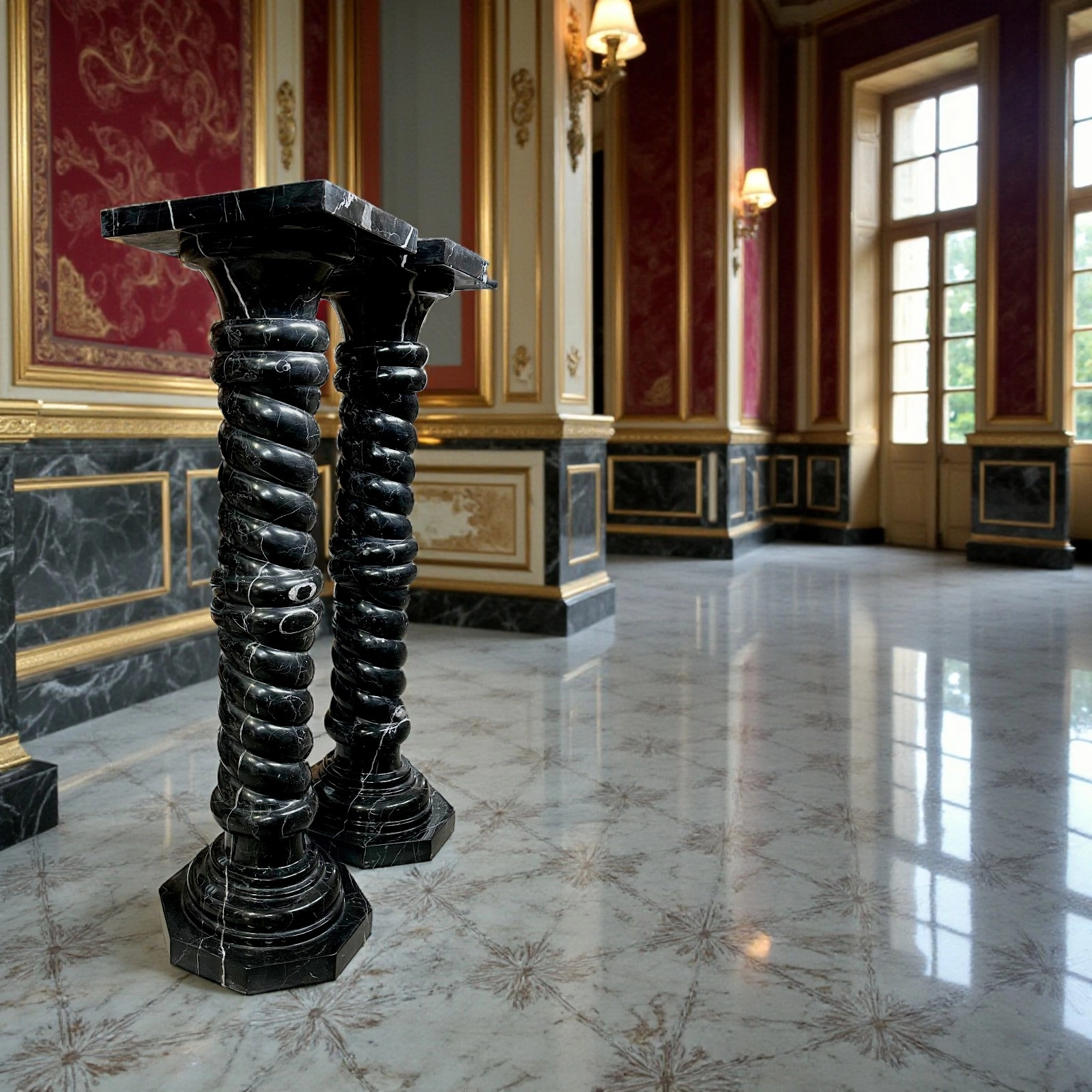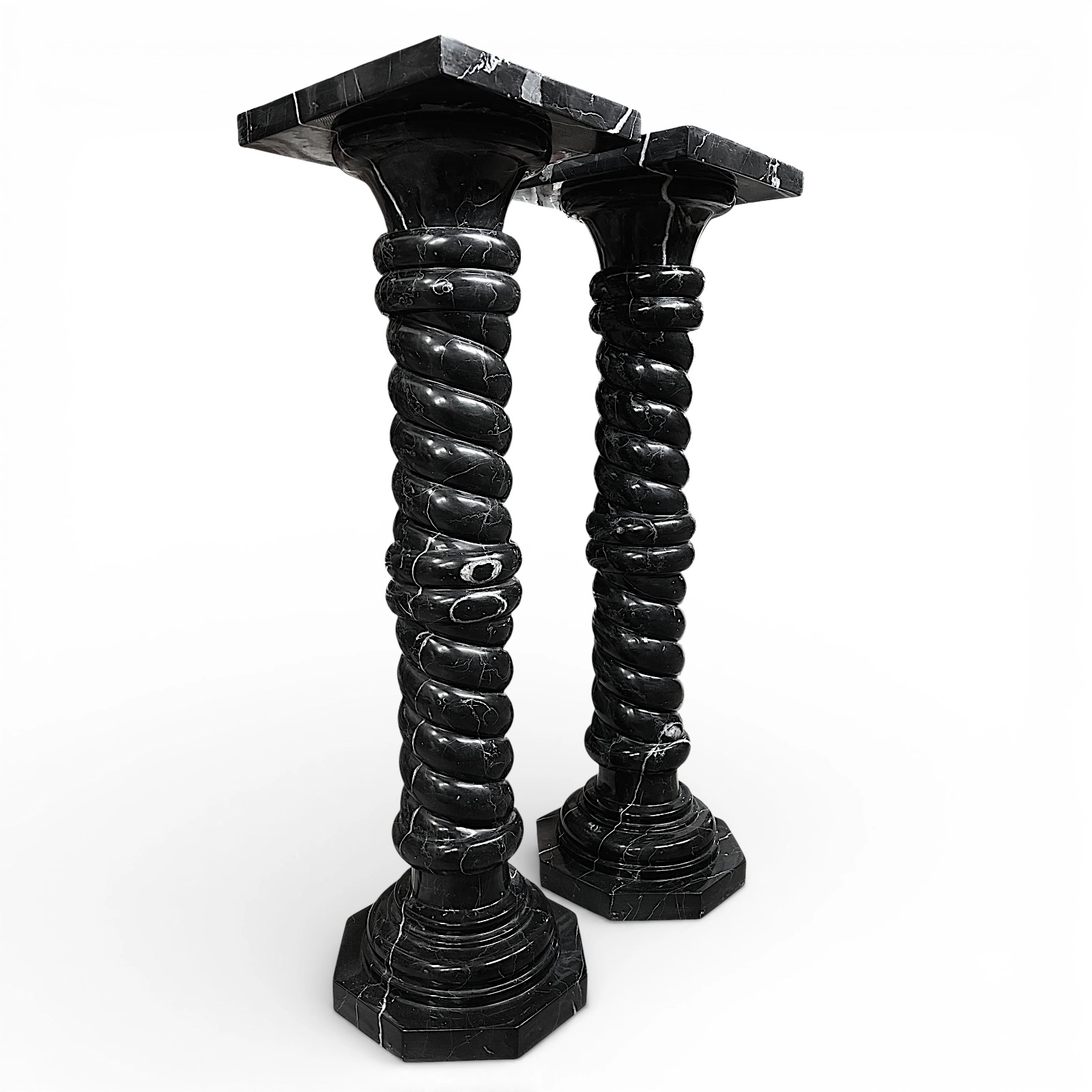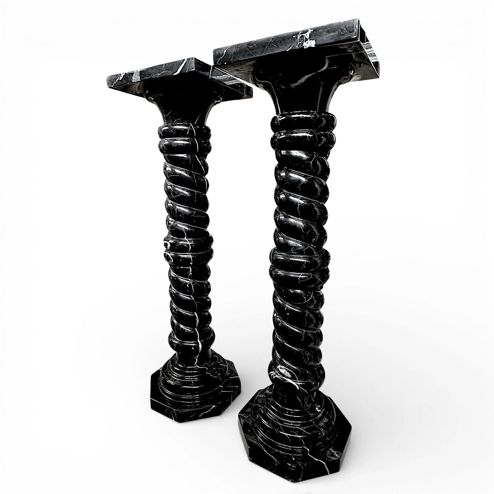 These two Black Marquinia marble columns are sculptural pieces of great refinement, designed to enhance elegant, high-end residential spaces. Their dimensions ensure harmonious proportions and a balanced visual presence. The twisted shafts add movement and dynamism, making the columns distinctive decorative elements that integrate naturally into classic, modern, and minimalist interiors.