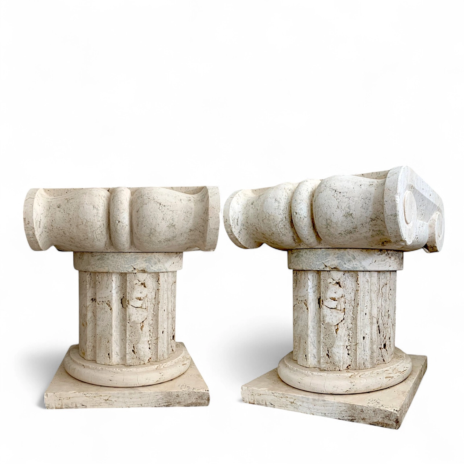 Ionic-style travertine capitals are more than just decorative elements: they are a perfect synthesis of art and architecture. Harmonious and balanced Ionic spirals evoke the balance of Greek classicism, making these objects an emblem of formal elegance. Their sculpted profiles and square bases offer an authoritative architectural presence, ideal as supports for busts, vases or sculptures, but also as standalone elements in cultured and sophisticated interior designs.