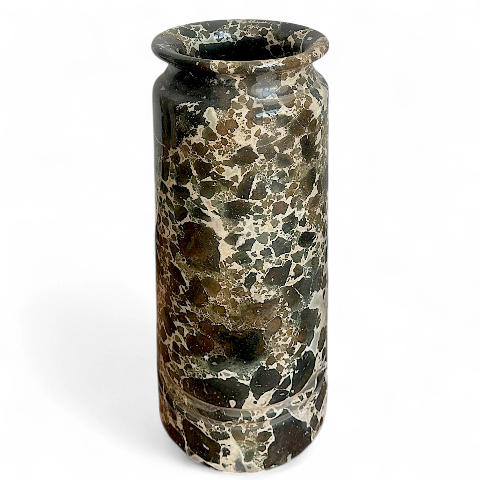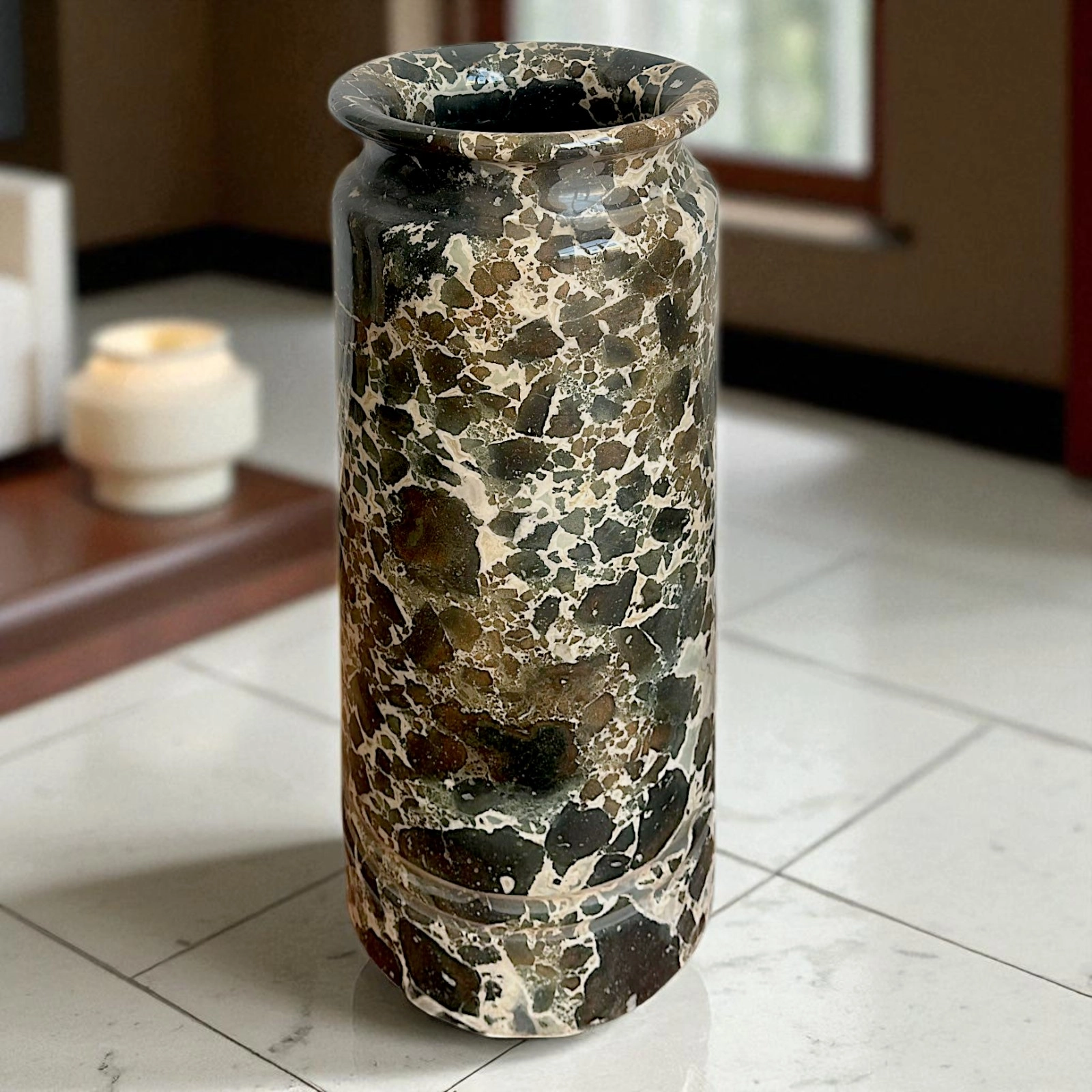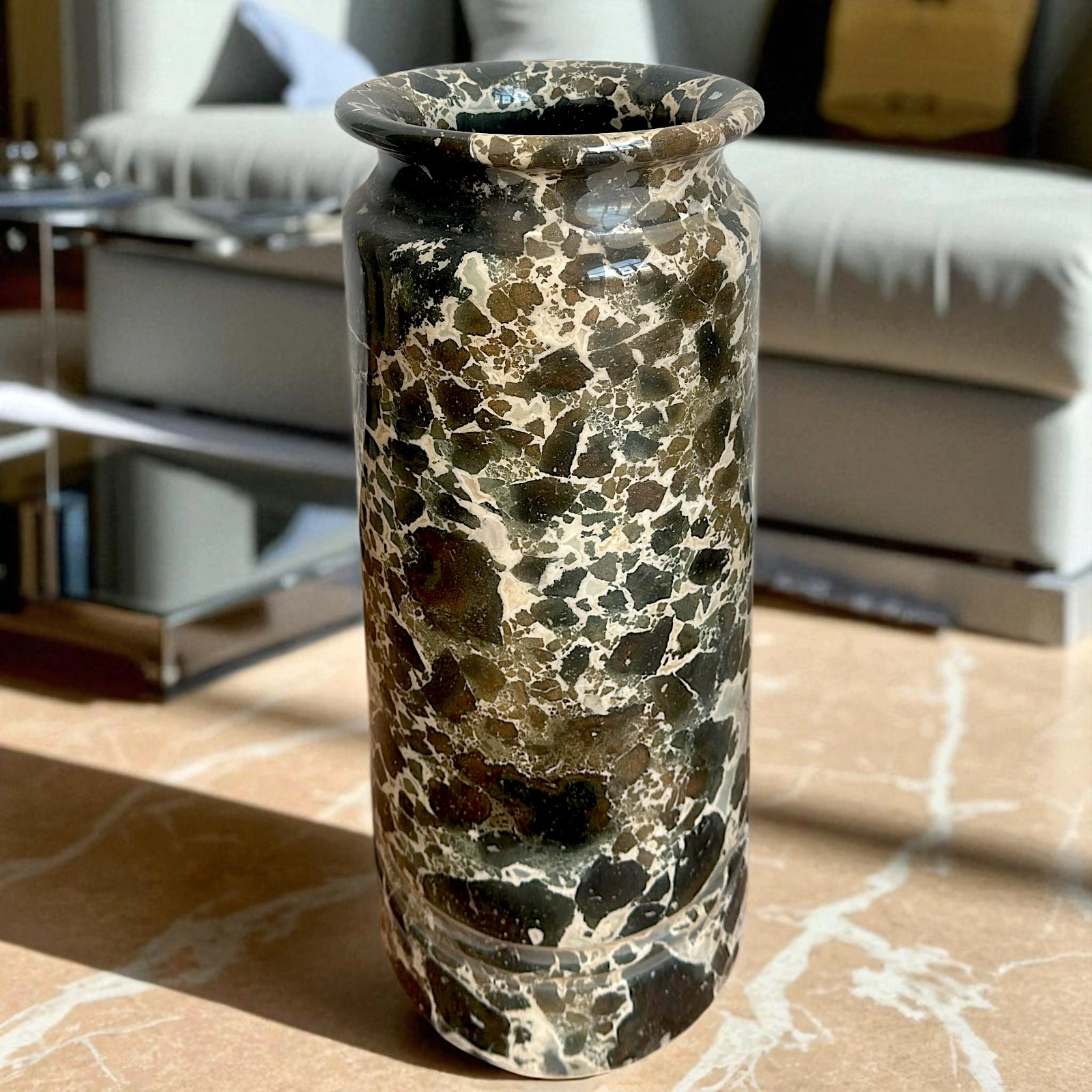 The Tiger Skin rock vase, with a diameter of 25cm and a height of 61cm, is a versatile and sophisticated creation. Designed as a flower or umbrella stand, it blends harmoniously into any setting, adding a touch of natural elegance. Its essential shape and warm green and brown colors enhance the inherent beauty of the stone, making it a visually striking piece of furniture.