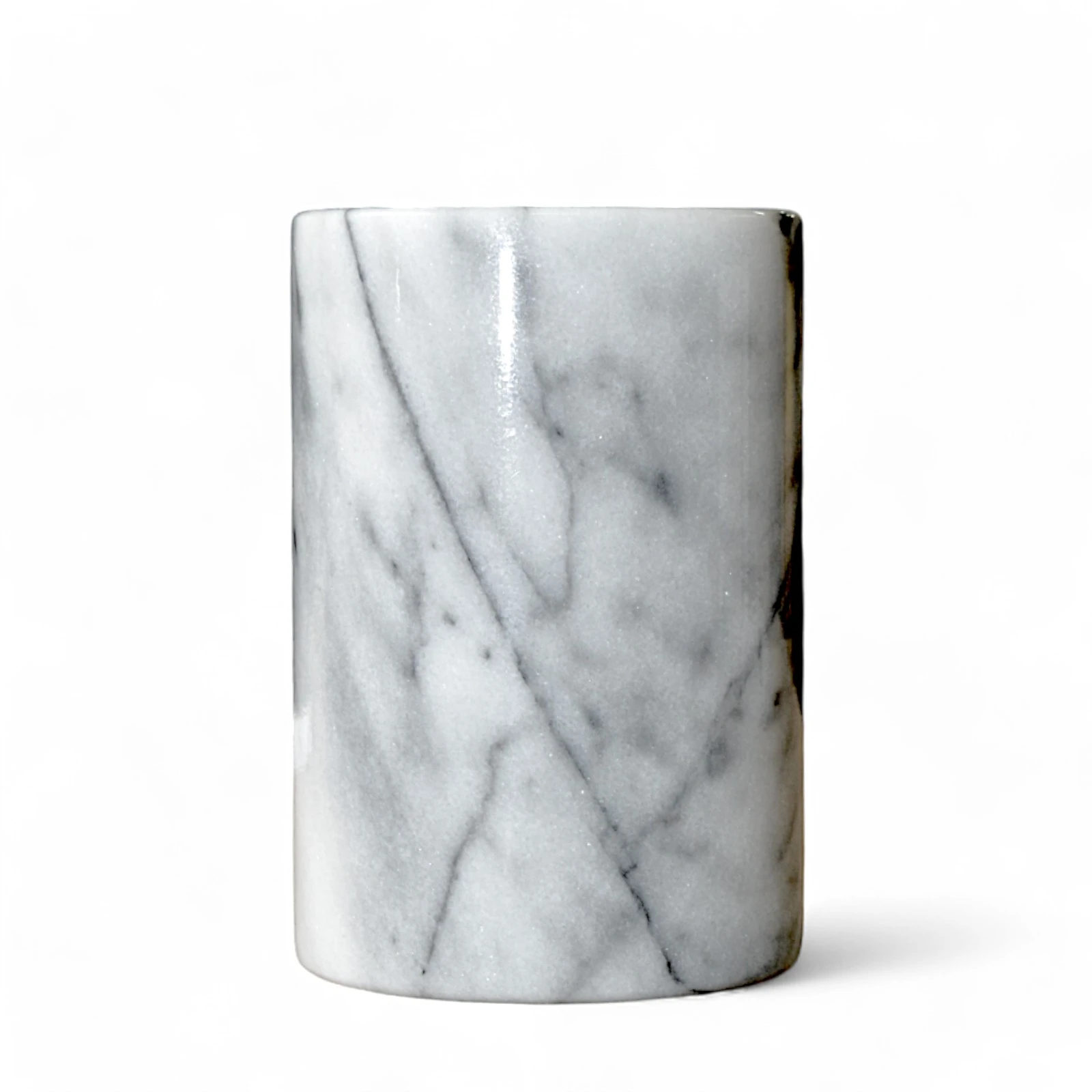 Tool holder made of white Carrara marble, famous for its purity and unique natural veining. Height 15 cm and diameter 10 cm. Perfect as a tool holder or elegant decorative vase. Polished surface for a soft touch that enhances any kitchen or living room. Craftsmanship that enhances the value of each piece as a unique and inimitable object. Versatile and...