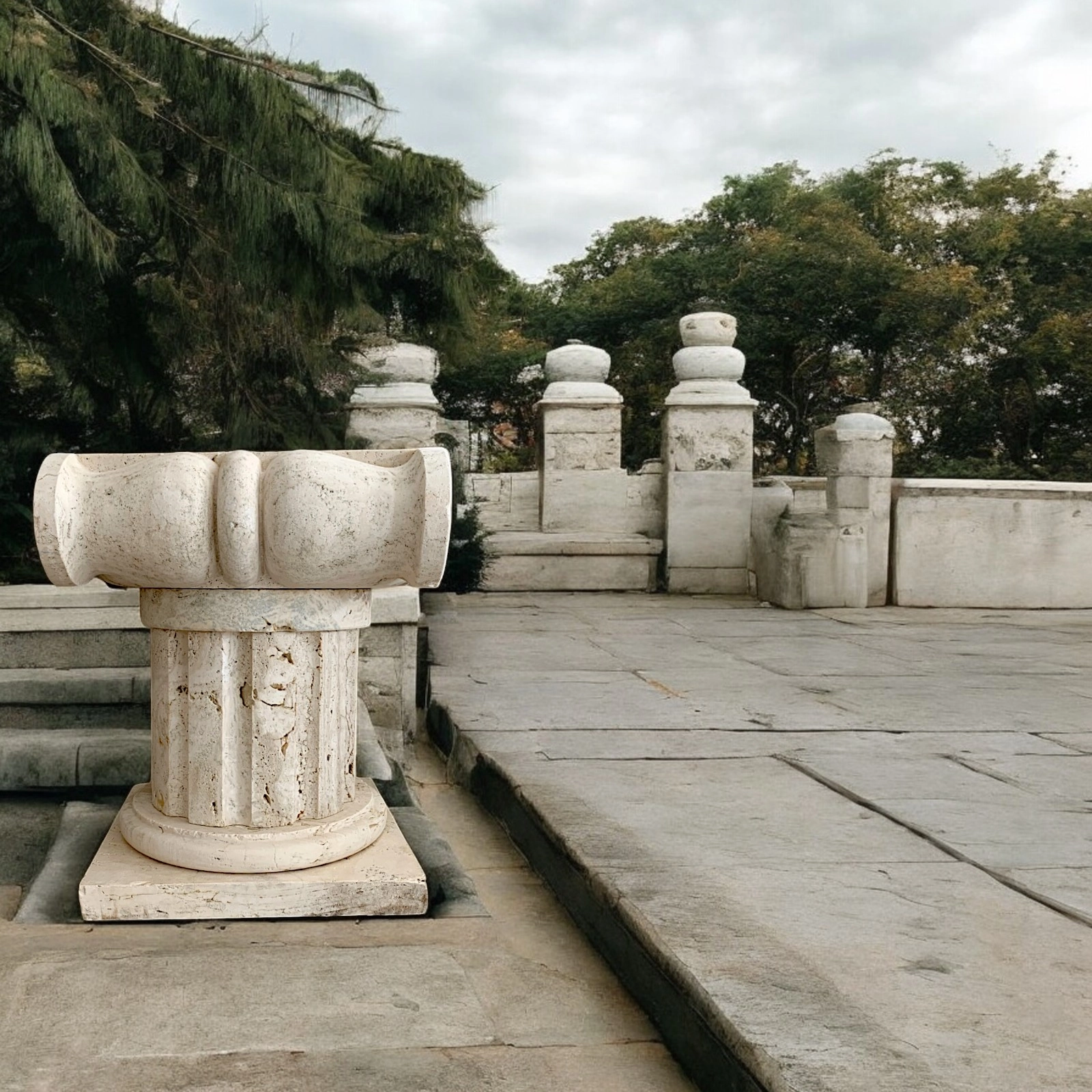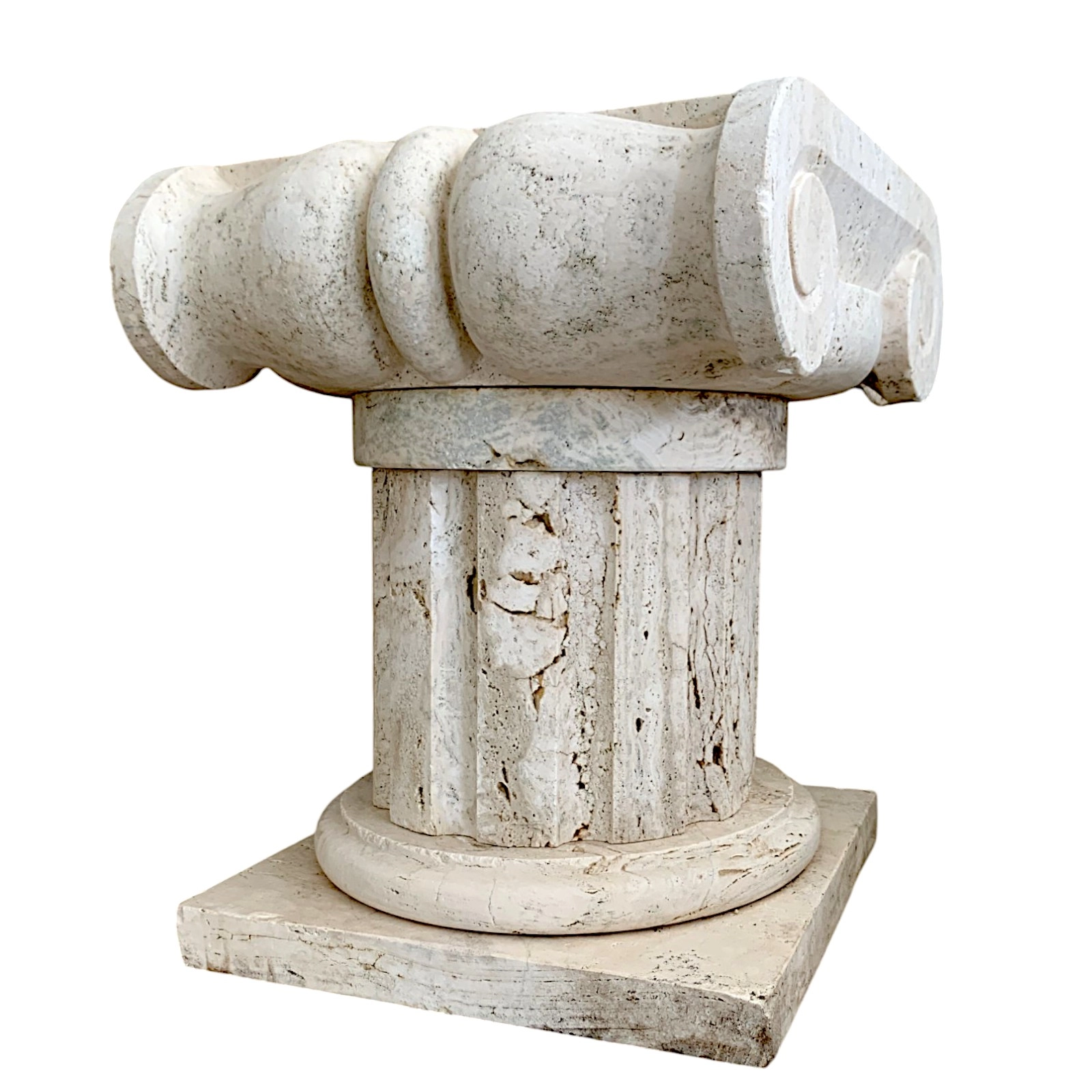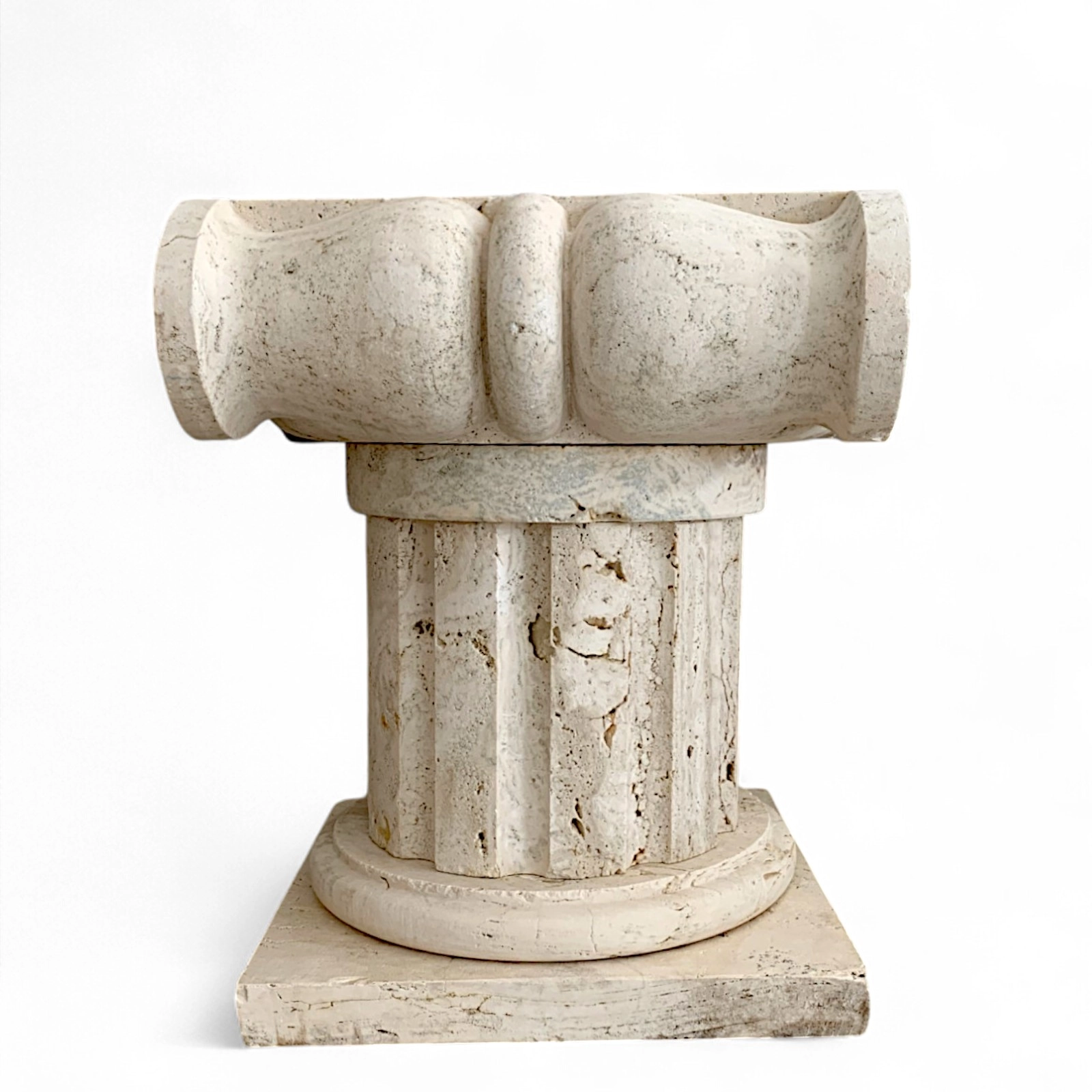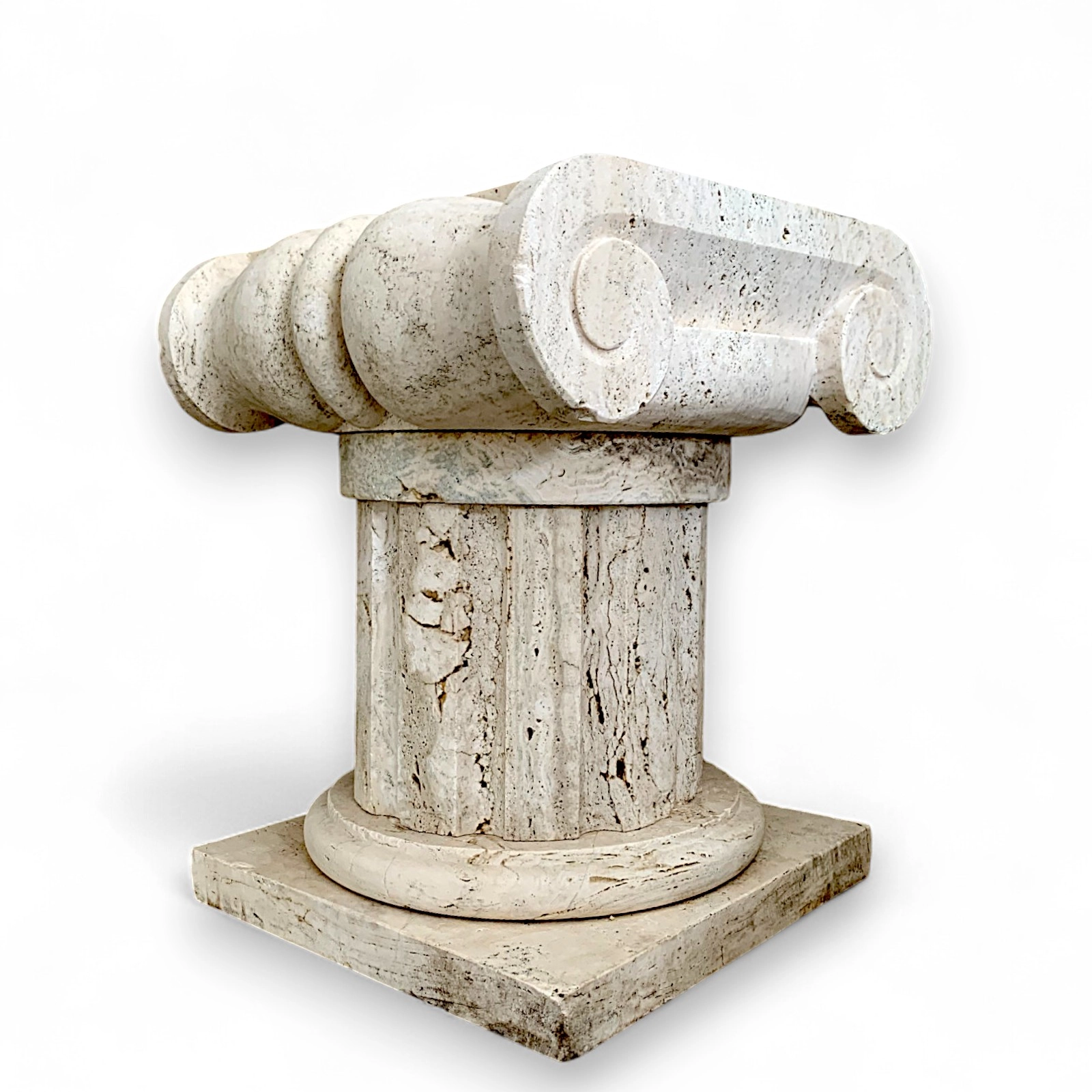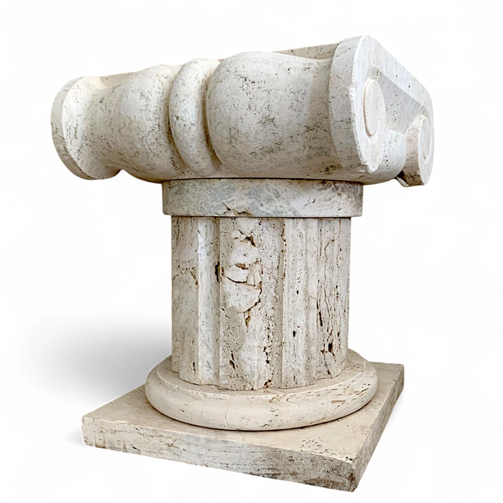 Il capitello in travertino stile ionico è molto più di un elemento decorativo: è una sintesi perfetta di arte e architettura. La spirale ionica, armonica e bilanciata, evoca l’equilibrio della classicità greca, rendendo l’oggetto un emblema di eleganza formale. Il profilo scolpito e la sua base quadrata offrono una presenza architettonica autorevole, ideale come supporto per busti, vasi o sculture, ma anche come elemento standalone in progetti d’interni colti e sofisticati.
