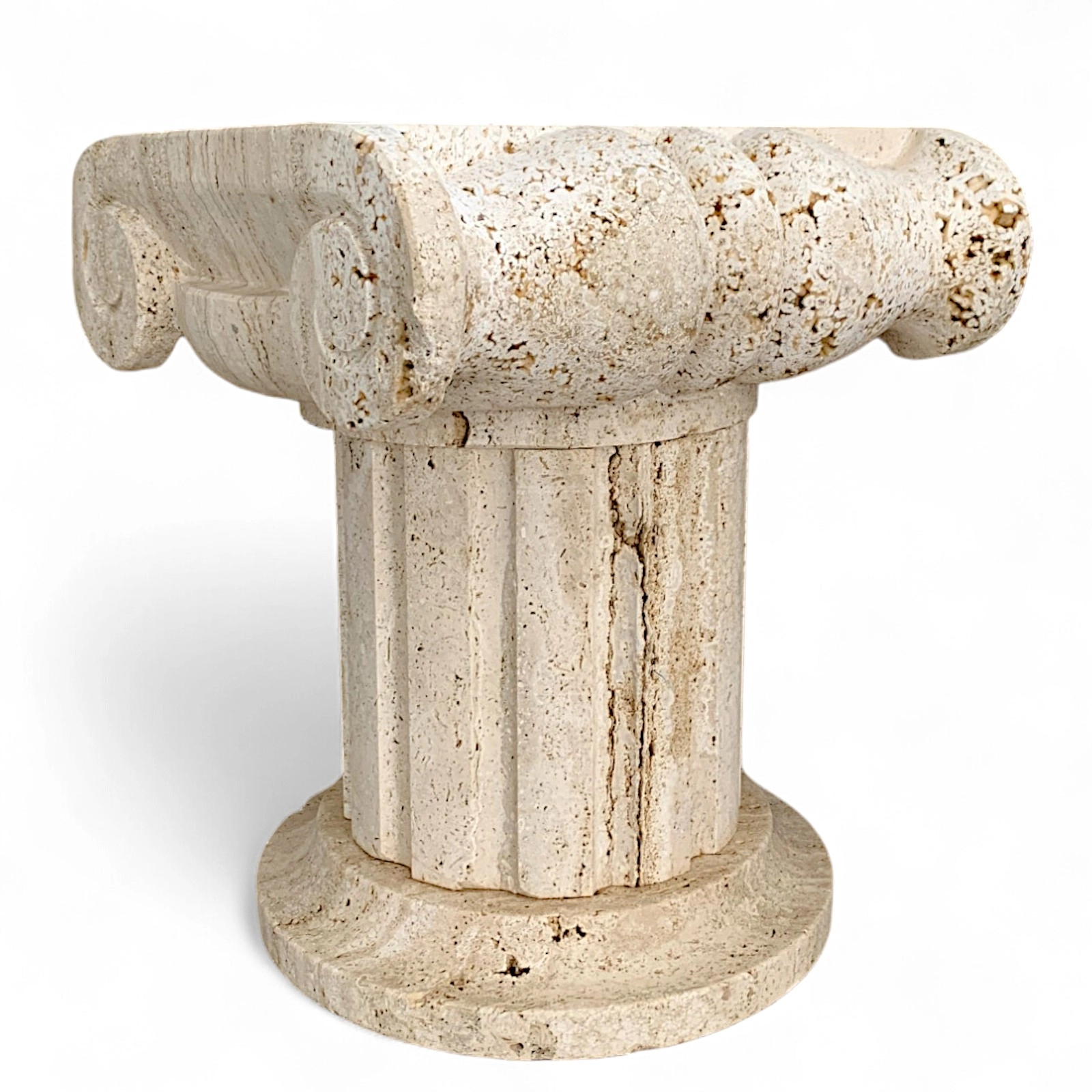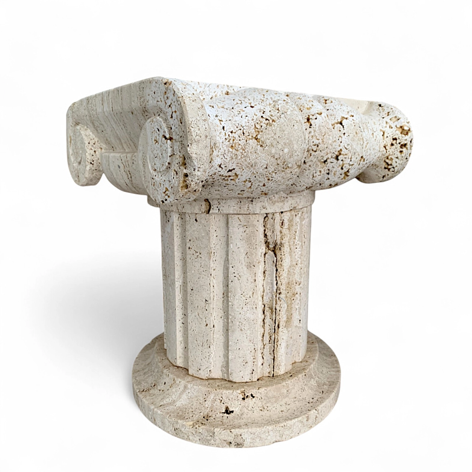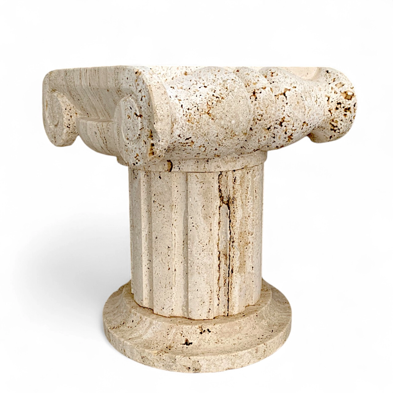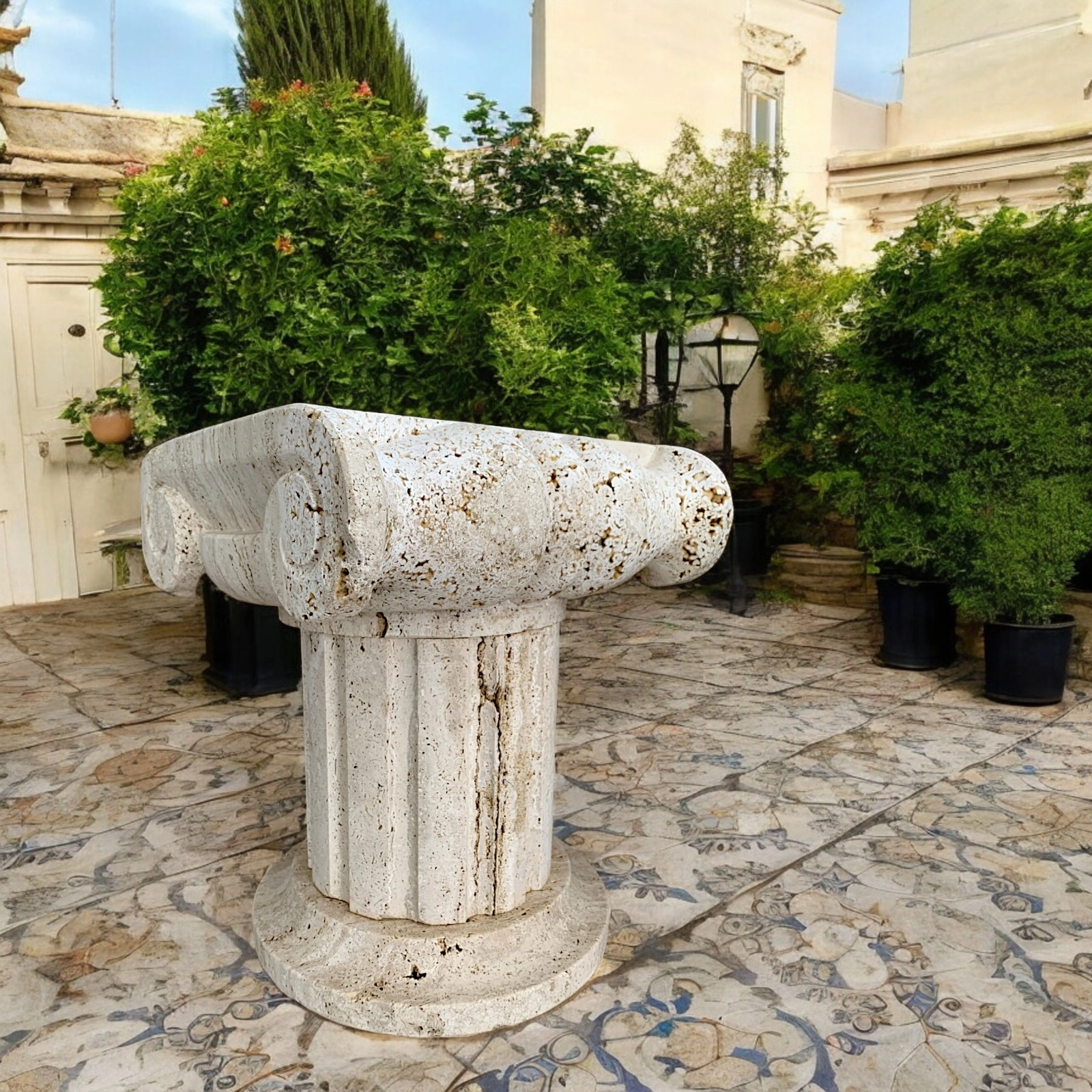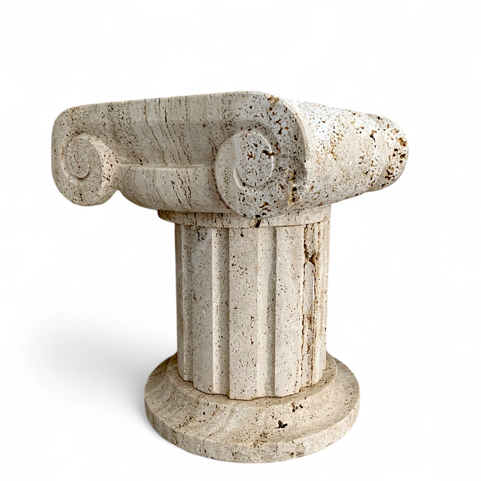 Il capitello in travertino stile ionico è molto più di un elemento decorativo: è una sintesi perfetta di arte e architettura. La spirale ionica, armonica e bilanciata, evoca l’equilibrio della classicità greca, rendendo l’oggetto un emblema di eleganza formale. Il profilo scolpito e la sua base tonda offrono una presenza architettonica autorevole, ideale come supporto per busti, vasi o sculture, ma anche come elemento standalone in progetti d’interni colti e sofisticati.