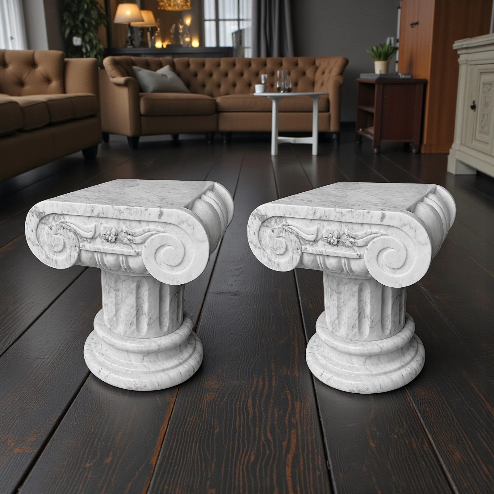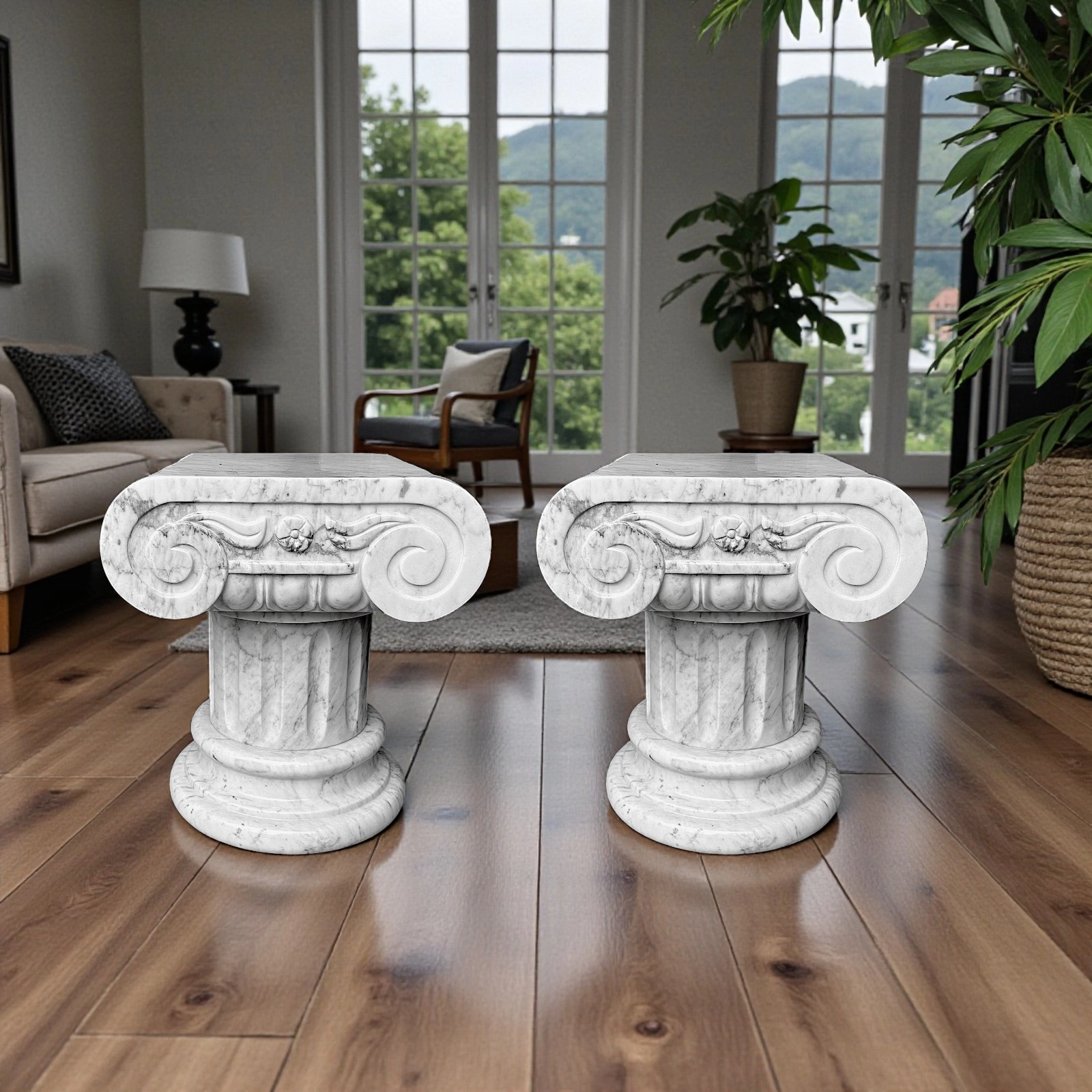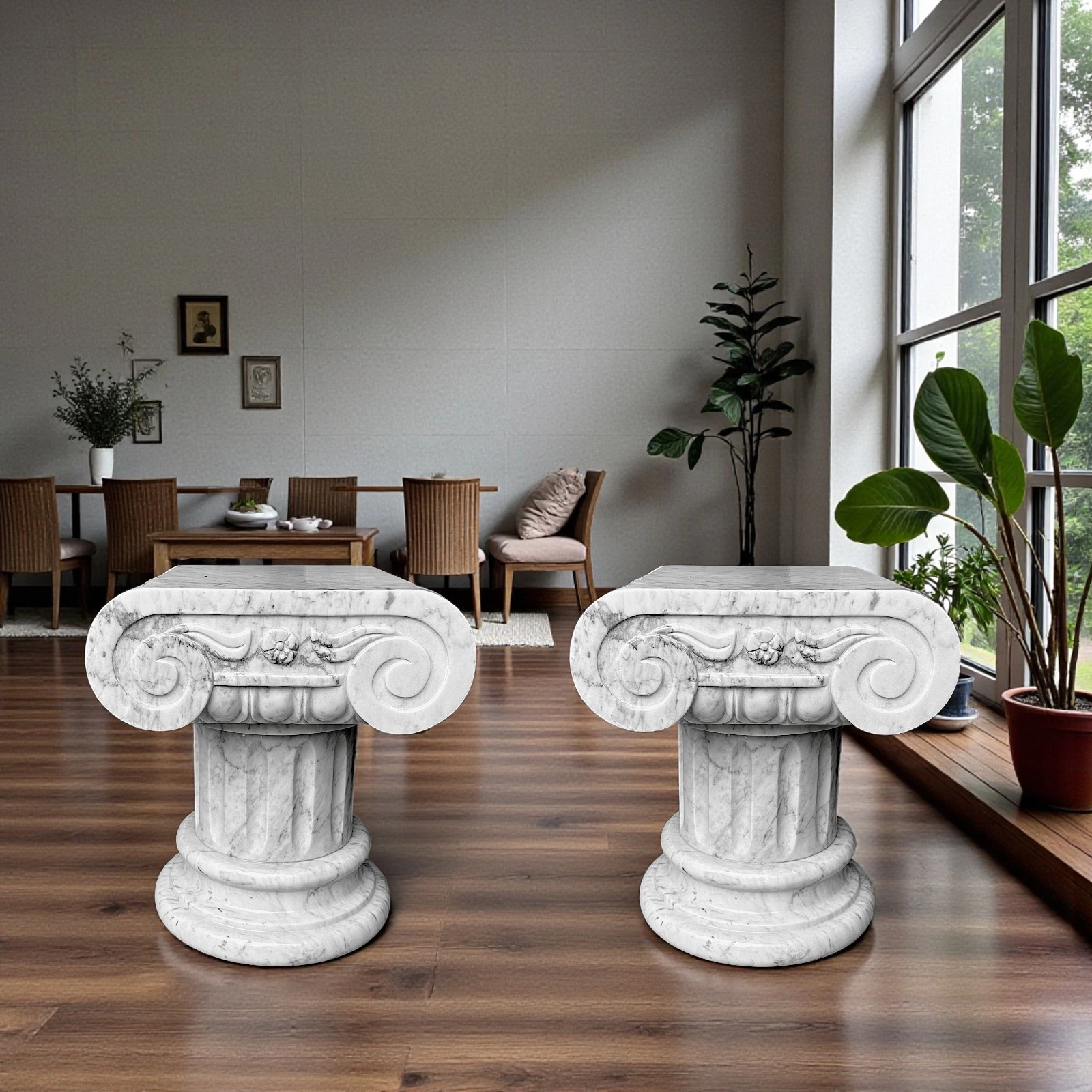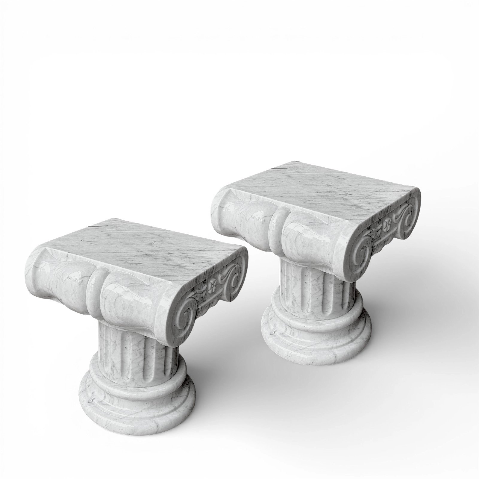 I capitelli possono essere esposti singolarmente o insieme, integrandosi perfettamente in contesti residenziali, studi, gallerie o spazi professionali. La forma Ionica simboleggia proporzione e raffinatezza architettonica, creando un dialogo naturale tra design contemporaneo e riferimenti classici. La struttura robusta garantisce stabilità e durata nel tempo, mantenendo leggerezza visiva e armonia nello spazio.