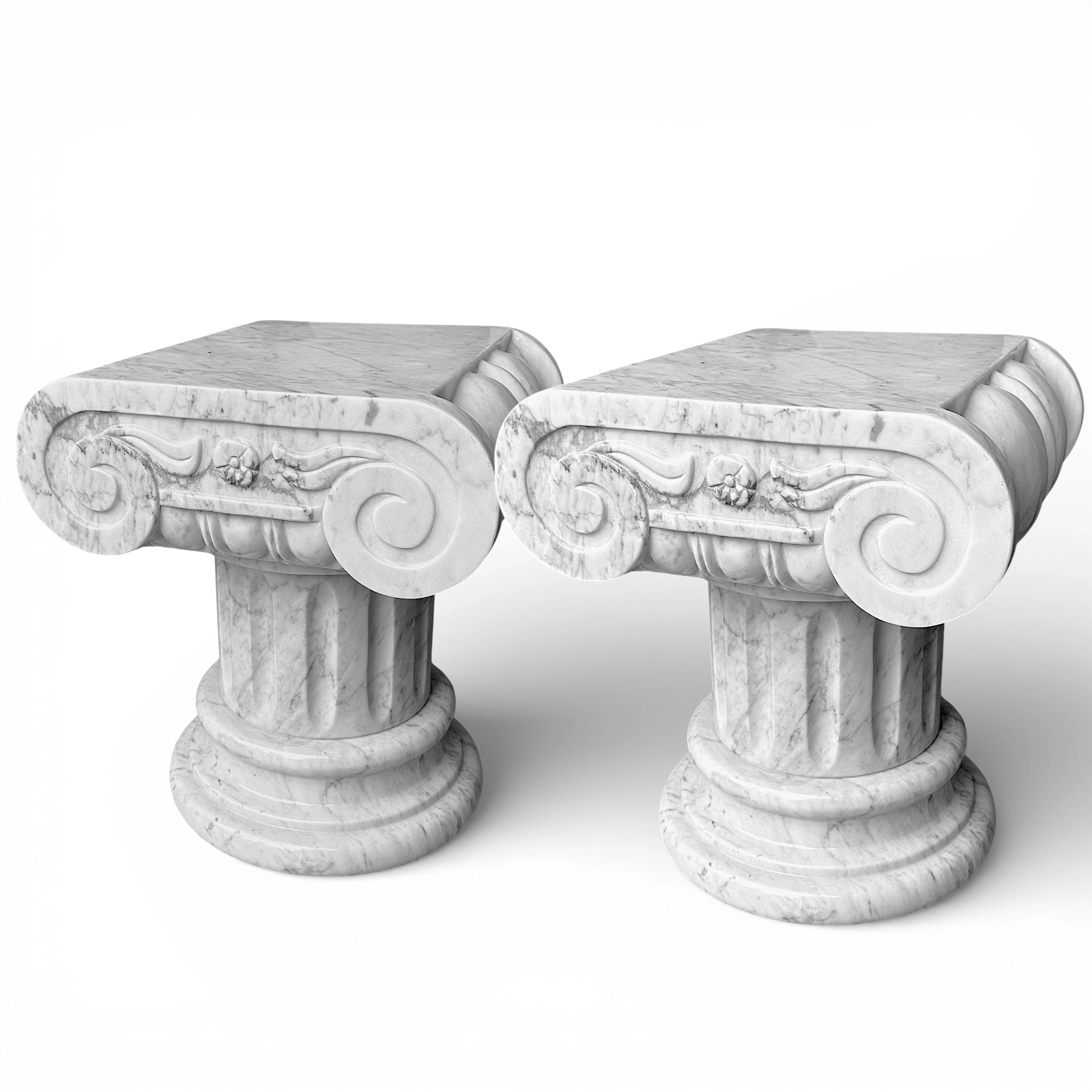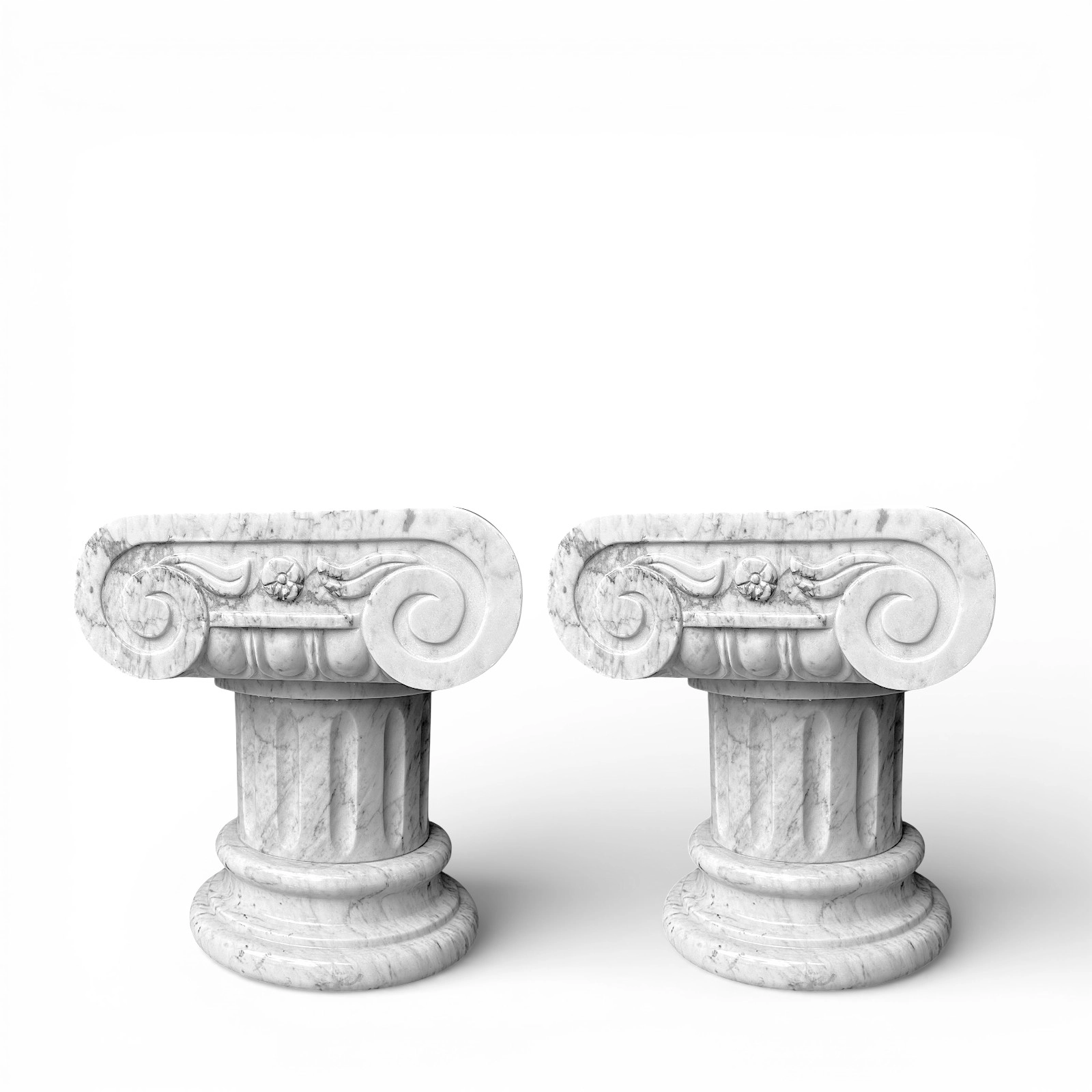 Il marmo bianco Carrara, rinomato per la brillantezza del bianco e le delicate venature grigie, conferisce autenticità, fascino e luminosità a ogni capitello. Lievi variazioni nel colore o nella texture sono naturali e testimoniano la lavorazione artigianale, rendendo ciascun pezzo unico.