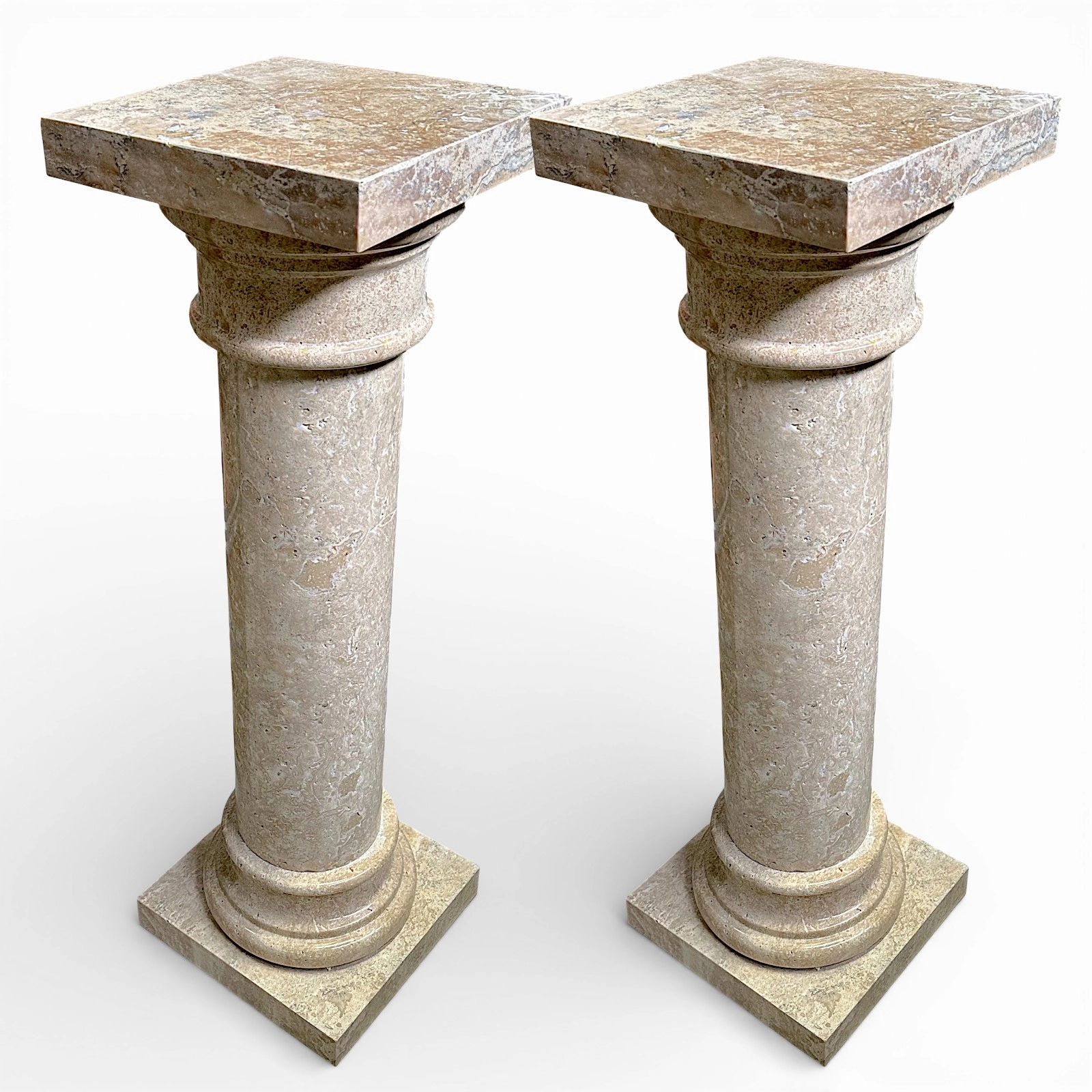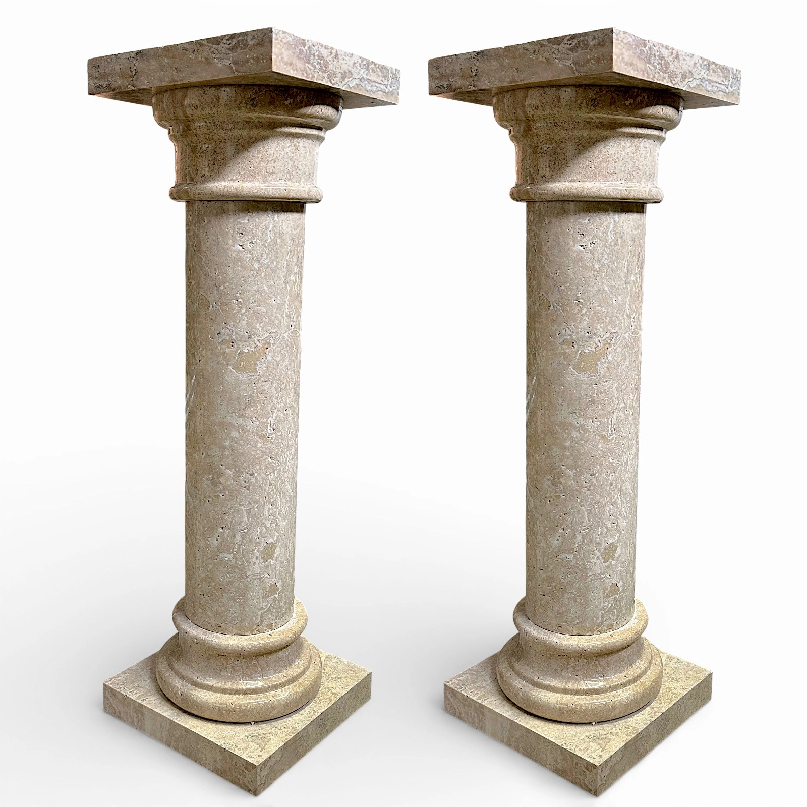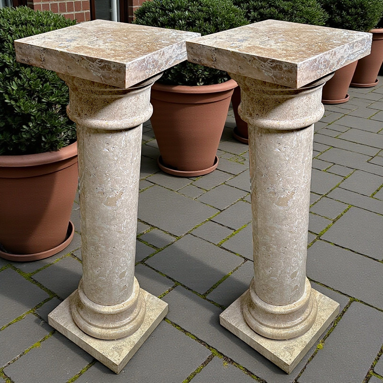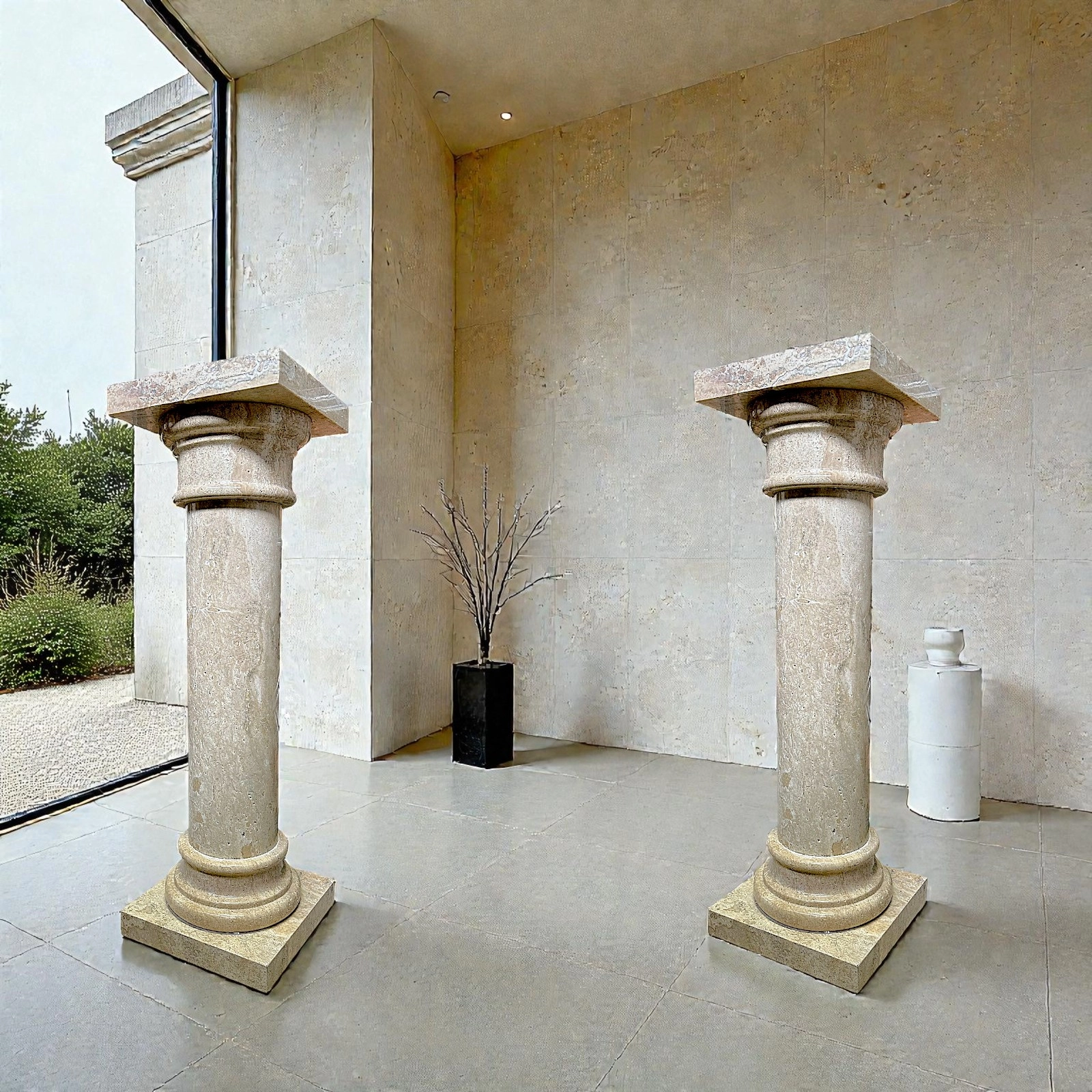 Il travertino, noto per le sue tonalità calde e le venature naturali, è stato utilizzato da secoli in architettura e scultura. Ogni colonna presenta caratteristiche uniche dovute alla pietra naturale e alla lavorazione artigianale, conferendo profondità, autenticità e fascino senza tempo. La coppia diventa così un punto focale elegante e versatile, perfetto per qualsiasi ambiente raffinato.