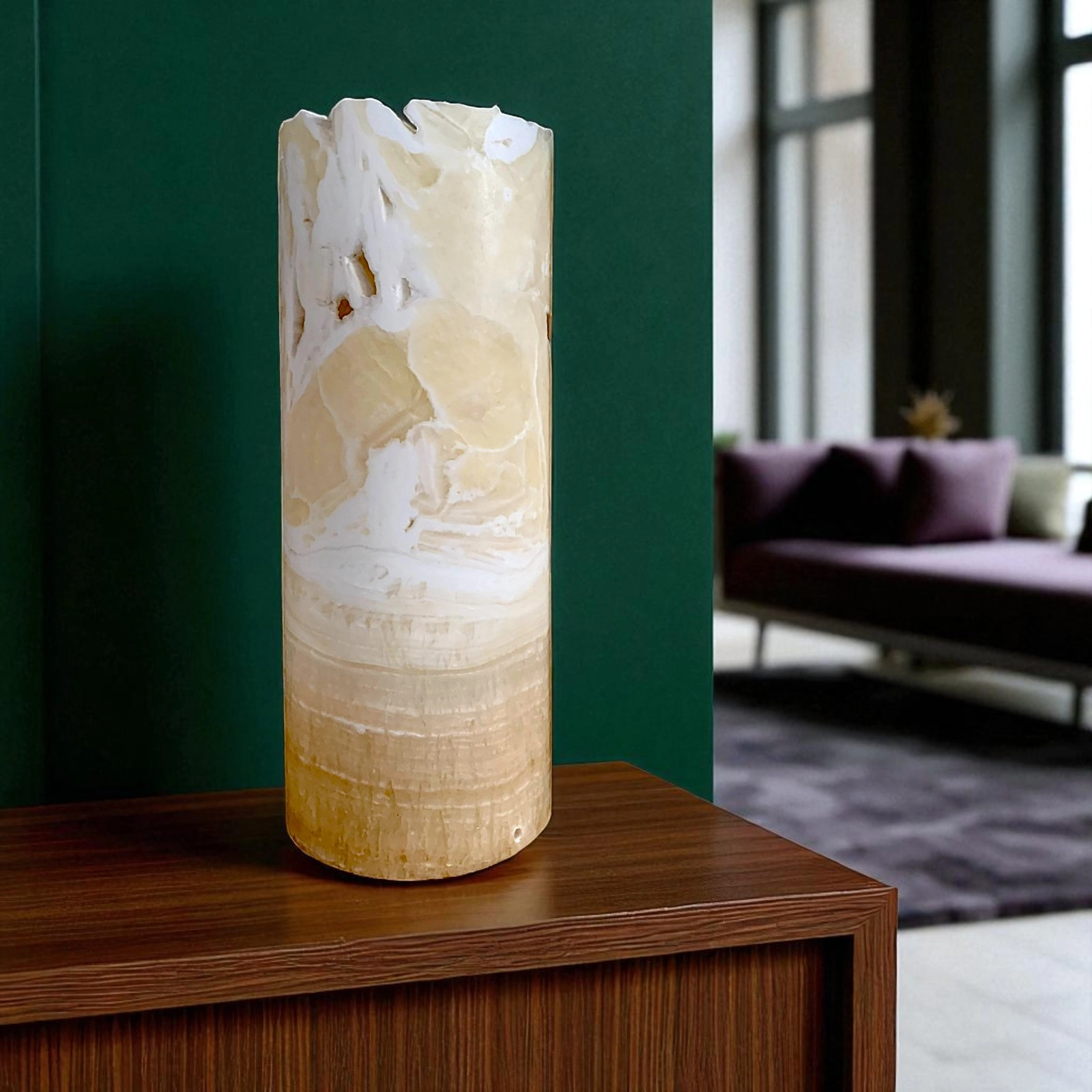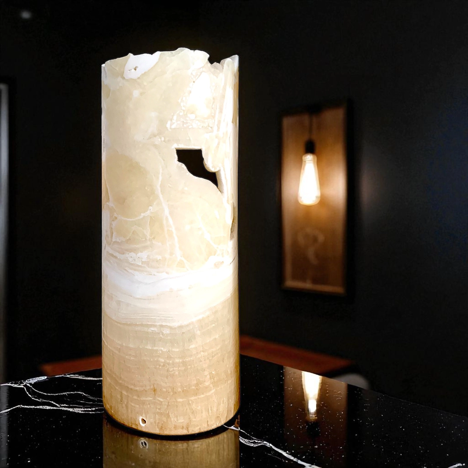 L’onice naturale è apprezzato per la sua traslucenza, capace di diffondere la luce in modo uniforme e suggestivo. La lampada diventa così non solo un oggetto decorativo, ma anche una fonte luminosa capace di creare un’atmosfera intima e accogliente. Perfetta come punto luce su una scrivania, su un comodino o su una console, aggiunge un tocco esclusivo agli spazi più ricercati.