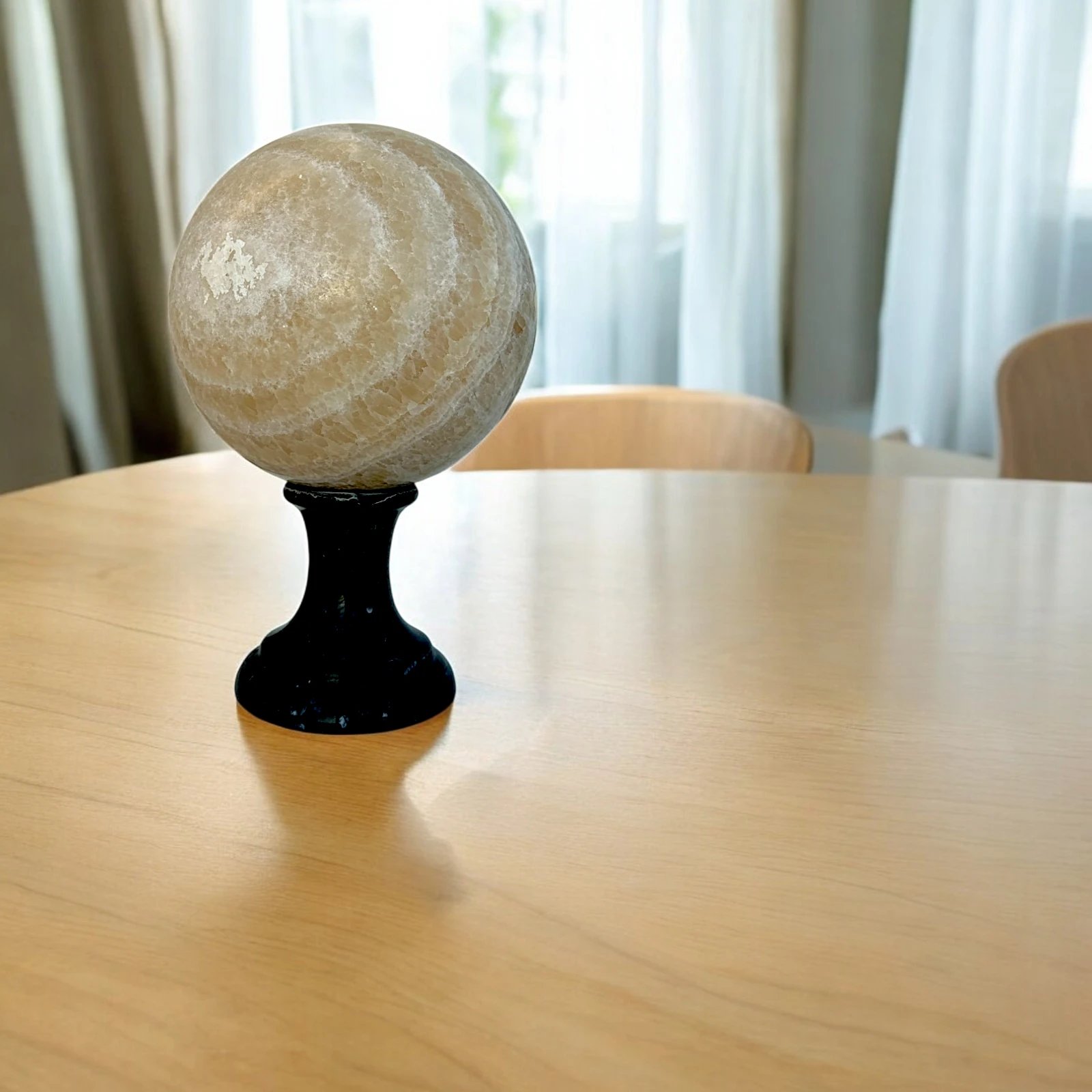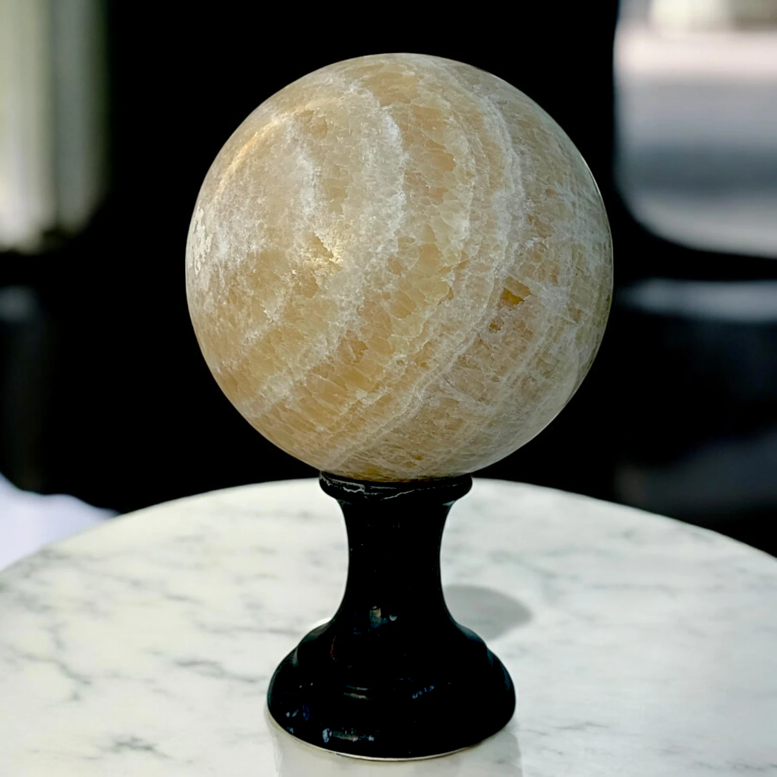 La lavorazione dell’onice giallo richiede grande maestria per esaltare le sue trasparenze e venature naturali. Ogni scultura è il risultato di un’accurata selezione della pietra e di una lavorazione attenta ai dettagli. Il poggiasfera in marmo nero enfatizza il colore caldo dell’onice, creando un’armonia visiva unica. Oggetto ideale per amatori dell’arte, appassionati di design e collezionisti di materiali pregiati.
